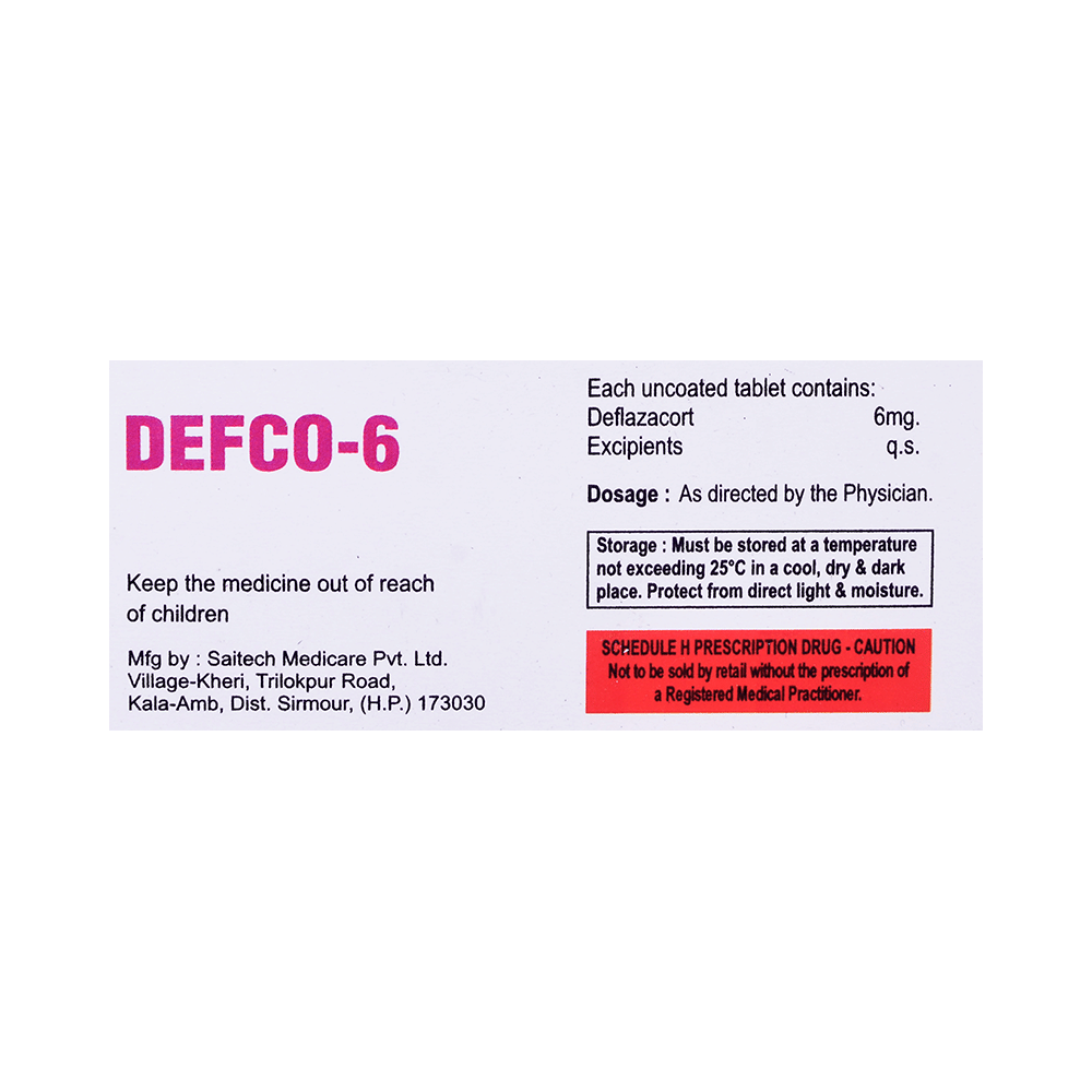 Defco 6 Tablet belongs to a group of medicines called steroids. It is used for the treatment of various diseases and conditions such as inflammatory conditions and autoimmune conditions. Defco 6 Tablet works by inhibiting the release of substances that cause swelling or by changing how the immune system works. It can be taken on an empty stomach or after food. Taking the medicine regularly at the right times increases its effectiveness. It is important to keep taking the medicine regularly until your doctor tells you it is safe to stop.Use of this medicine may cause some common side effects such as increased appetite, weight gain, frequent urge to urinate, Cushing syndrome, cough, upper respiratory tract infection, abnormal hair growth, obesity, and nasopharyngitis. If any of these side effects bother you, let your doctor know.Defco 6 Tablet can make it harder for you to fight off infections. Tell your doctor if you have any signs of infection such as a fever or sore throat. Before taking the medicine, you should let your doctor know of all the other medicines you are taking. Pregnant and breastfeeding women should consult their doctors before taking the medicine.