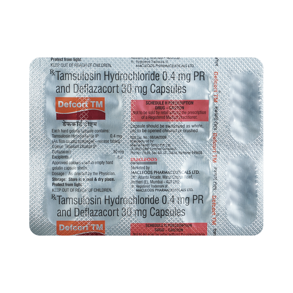 Defcort TM Capsule PR is a combination of two medicines: Tamsulosin and Deflazacort. Tamsulosin is an alpha-blocker. It works by relaxing the muscle around the bladder exit and prostate gland so as to allow easy passage of urine. Deflazacort is a steroid medicine. It works by reducing inflammation (swelling) in the kidneys to promote the passage of the stones through urine.