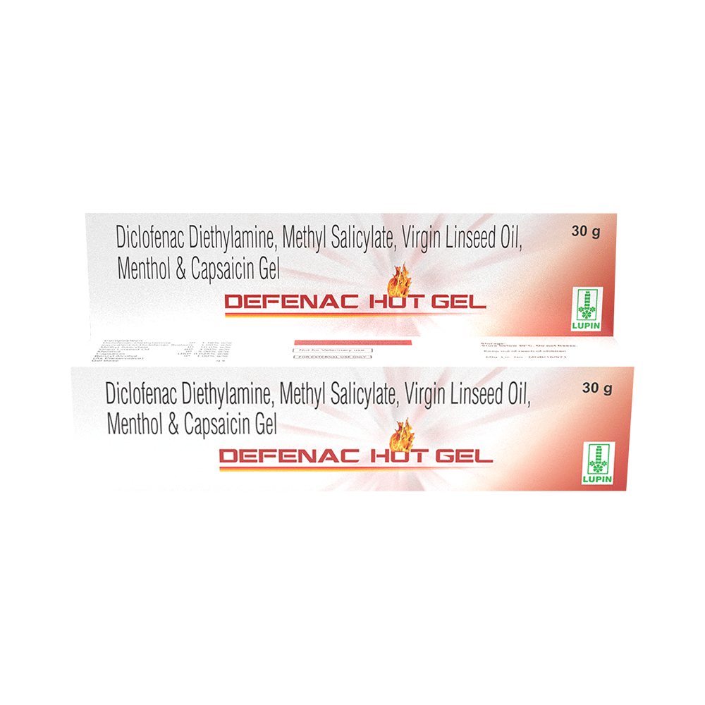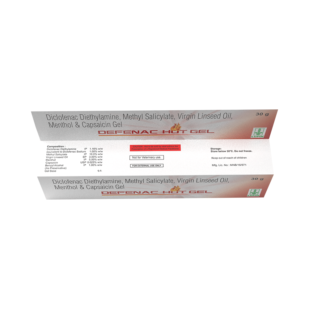 Defenac Hot Gel is a combination medicine that helps in relieving pain. It works by first cooling the skin then warming it up. This cooling and warming up action improves blood circulation and distracts the patient from pain. Defenac Hot Gel is only meant for external use and should be used strictly as advised by your doctor. Rub a thin layer of the medicine into the affected areas with clean and dry hands. Avoid getting in contact with your eyes, nose, or mouth and avoid applying it on wounded or damaged skin. In case of accidental contact with these areas, you should rinse it with plenty of cold water.Using this medicine may cause common side effects such as burning or stinging sensation, irritation, itching, and redness at the site of application in some people. Usually, the side effects will slowly go away as your body gets used to it. If they get worse or do not go away, you should let your doctor know.Although medicines used on the skin are not normally affected by other medicines you should let your doctor know if you are taking any other medicine to be safe. You should also let your doctor know if you have any medical conditions or disorders to make sure it is safe. Ask your doctor for advice if you are pregnant or breastfeeding.