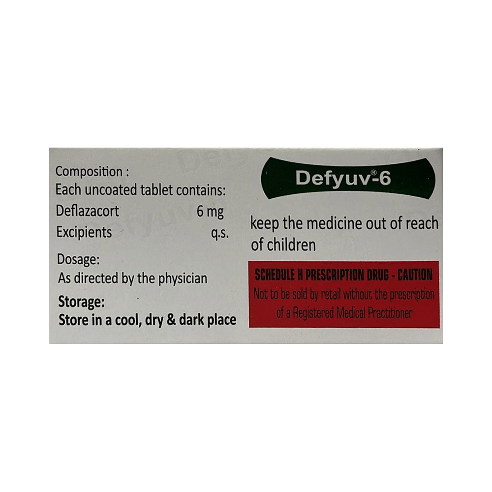 Defyuv 6 Tablet belongs to a group of medicines called steroids. It is used for the treatment of various diseases and conditions such as inflammatory conditions and autoimmune conditions. Defyuv 6 Tablet works by inhibiting the release of substances that cause swelling or by changing how the immune system works. It can be taken on an empty stomach or after food. Taking the medicine regularly at the right times increases its effectiveness. It is important to keep taking the medicine regularly until your doctor tells you it is safe to stop.Use of this medicine may cause some common side effects such as increased appetite, weight gain, frequent urge to urinate, Cushing syndrome, cough, upper respiratory tract infection, abnormal hair growth, obesity, and nasopharyngitis. If any of these side effects bother you, let your doctor know.Defyuv 6 Tablet can make it harder for you to fight off infections. Tell your doctor if you have any signs of infection such as a fever or sore throat. Before taking the medicine, you should let your doctor know of all the other medicines you are taking. Pregnant and breastfeeding women should consult their doctors before taking the medicine.