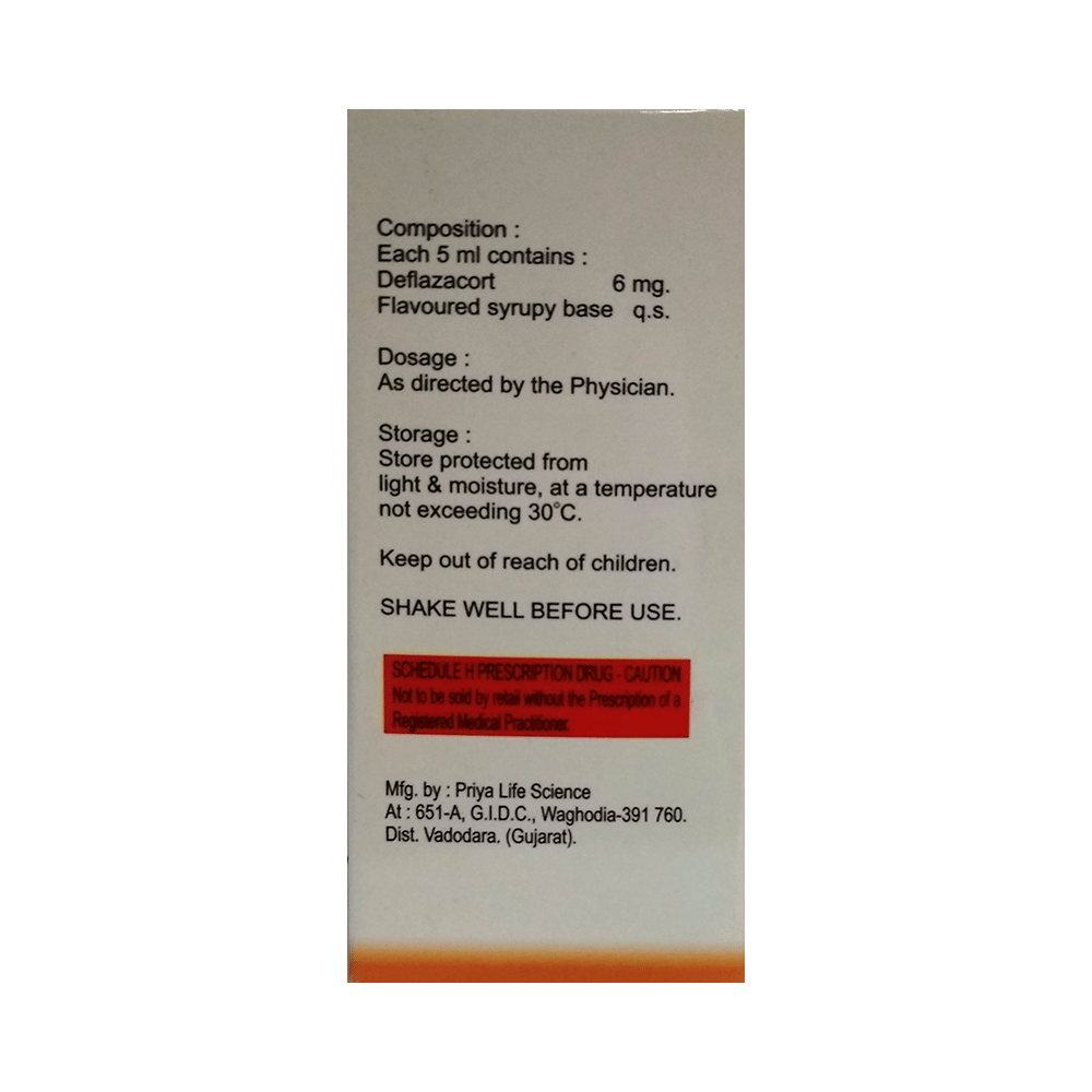 Defzo 6 Oral Suspension Raspberry & Vanilla belongs to a group of medicines called steroids. It is used for the treatment of various diseases and conditions such as inflammatory conditions and autoimmune conditions. Defzo 6 Oral Suspension Raspberry & Vanilla works by inhibiting the release of substances that cause swelling or by changing how the immune system works. It can be taken on an empty stomach or after food. Taking the medicine regularly at the right times increases its effectiveness. It is important to keep taking the medicine regularly until your doctor tells you it is safe to stop.Use of this medicine may cause some common side effects such as increased appetite, weight gain, frequent urge to urinate, Cushing syndrome, cough, upper respiratory tract infection, abnormal hair growth, obesity, and nasopharyngitis. If any of these side effects bother you, let your doctor know.Defzo 6 Oral Suspension Raspberry & Vanilla can make it harder for you to fight off infections. Tell your doctor if you have any signs of infection such as a fever or sore throat. Before taking the medicine, you should let your doctor know of all the other medicines you are taking. Pregnant and breastfeeding women should consult their doctors before taking the medicine.