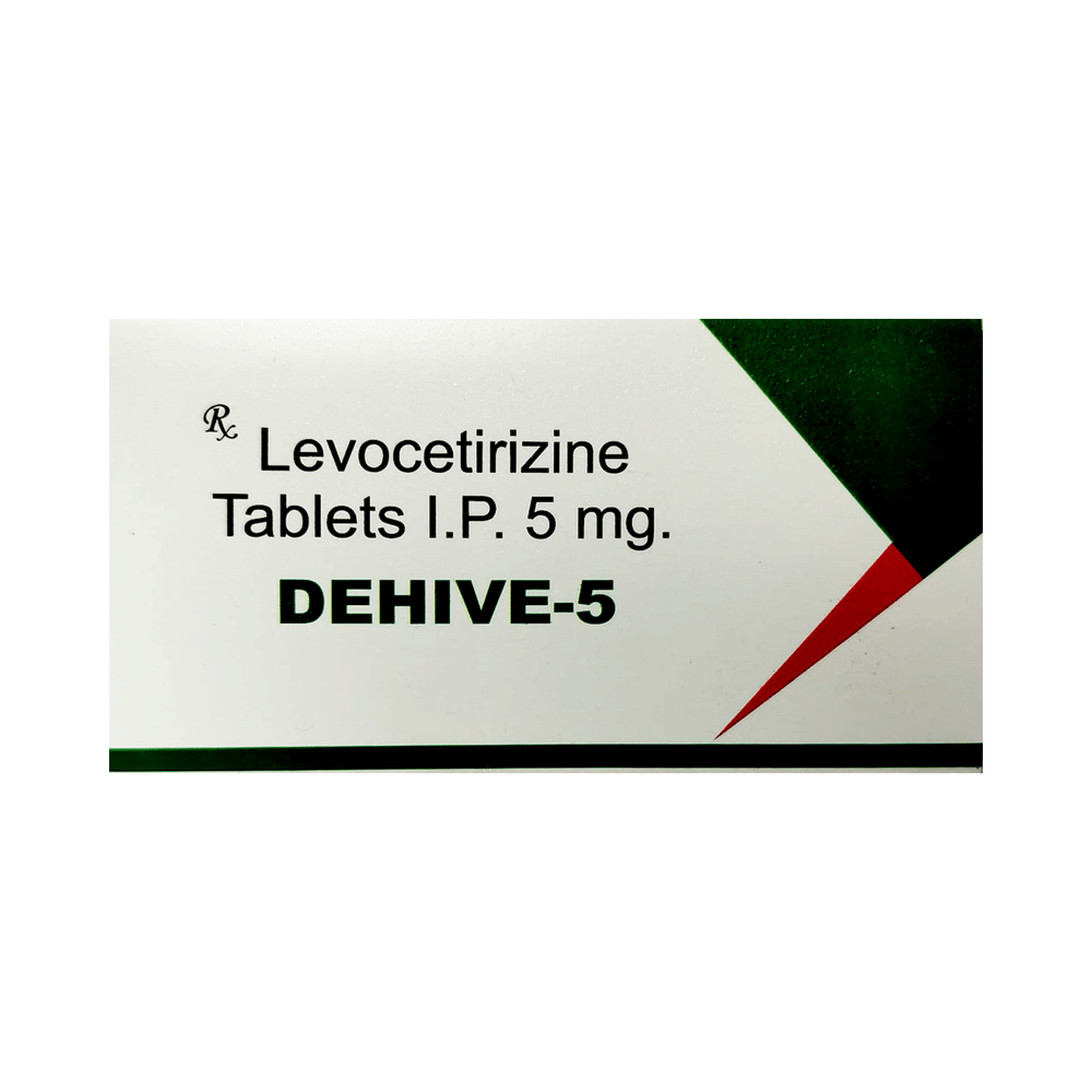 Dehive 5 Tablet belongs to a group of medicines called antihistamines. It is used to treat various allergic conditions such as hay fever, conjunctivitis, some skin reactions such as eczema, hives, and reactions to bites and stings. It also relieves watery eyes, runny nose, sneezing, and itching. Dehive 5 Tablet can be taken with or without food. The dose required by you may vary depending on what you are taking it for. This medicine is usually taken in the evening, but follow the advice of your doctor on how to take it. You may need this medicine only on days you have symptoms, but if you are taking it to prevent the symptoms then you should take it regularly. If you miss doses or stop taking it earlier than advised, your symptoms may come back.Common side effects include somnolence (sleepiness), dry mouth, fatigue, fever, cough, nasopharyngitis, and nosebleed. These are usually mild and go away after a couple of days as your body adjusts to it. Consult your doctor if any of the side effects persist or worry you.Before taking it, tell your doctor if you have any kidney problems or epilepsy (seizures). Your dose may need to be modified or this medicine may not suit you. Some other medicines can interact with this medicine so let your healthcare team know what else you are taking. You should also talk to your doctor before using this medicine if you are pregnant or breastfeeding, although it is not thought to be harmful.
