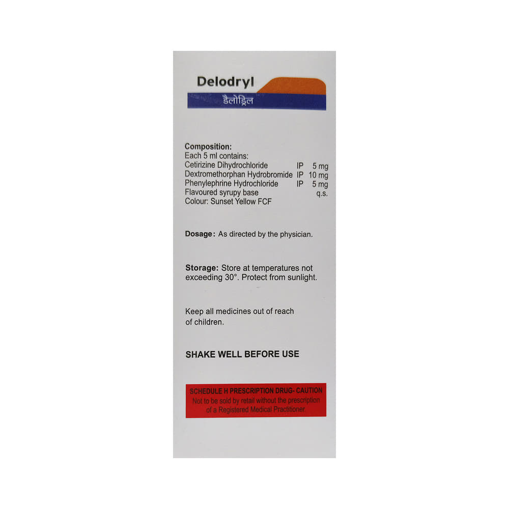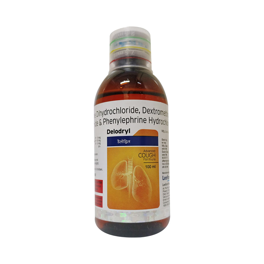Delodryl Syrup is a combination medicine used in the treatment of dry cough. It narrows the small blood vessels and provides relief from congestion or stuffiness in the nose. It also relieves allergy symptoms like watery eyes, sneezing, runny nose, and throat irritation. Delodryl Syrup is taken with or without food in a dose and duration as advised by the doctor. The dose you are given will depend on your condition and how you respond to the medicine. You should keep taking this medicine for as long as your doctor recommends. If you stop treatment too early your symptoms may come back and your condition may worsen. Let your doctor know about all other medications you are taking as some may affect, or be affected by this medicine.The most common side effects are nausea, vomiting, upset stomach, dryness in mouth, headache, and fatigue. Most of these are temporary and usually resolve with time. Contact your doctor straight away if you are at all concerned about any of these side effects. This medicine can also cause dizziness and sleepiness, so do not drive or do anything that requires mental focus until you know how this medicine affects you. Avoid drinking alcohol while taking this medicine as it can make dizziness worse.Never support self-medication or recommend your medicine to another person. Keep it out of reach of children. It is beneficial to have plenty of fluids while taking this medication. Before taking it, you should tell your doctor if you have any kidney or liver diseases so that your doctor can prescribe a suitable dose for you. Pregnant or breastfeeding women should also consult their doctor before taking this medicine.