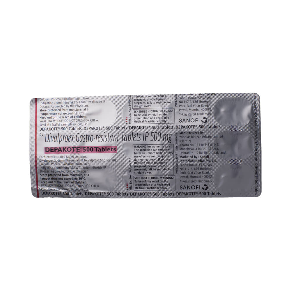 Depakote 500 Tablet is a medication used to treat epilepsy, seizures, bipolar disorder, mania, trigeminal neuralgia, and migraines. It works by stabilizing brain activity. Always use it under medical supervision for safe and effective treatment. Depakote 500 Tablet may be used alone or in combination with other medicines. Your doctor will determine the appropriate dose and frequency to effectively control your symptoms. You can take this medicine with or without food, but for the best results, take it at the same time each day. It usually takes a couple of weeks to work. It is important to take this medicine regularly and for as long as you are advised, even if you feel well. Missing doses may trigger seizures, and if you stop, your condition may get worse. It should never be stopped suddenly.The most common side effects of Depakote 500 Tablet include headache, constipation, nausea, vomiting, dizziness, weight gain, rash, back pain, and abdominal pain. Most of these are not serious. Continue taking the medicine, but consult your doctor if these side effects persist or become bothersome. However, if you notice a skin rash or redness, tell your doctor straight away. Long-term treatment with this medicine can cause osteoporosis (reduced bone mass) and increase your risk of breaking a bone. Also, Depakote 500 Tablet may rarely lead to suicidal thoughts and behaviors. If your mood becomes depressed, tell your doctor.Depakote 500 Tablet may not be suitable for everybody. Before using it, tell your doctor if you have ever had heart problems, kidney or liver disease, difficulty urinating, depression, or suicidal thoughts. Some medicines can interfere with it and should not be taken together, so tell your doctor about all the medicines you are taking to make sure it is safe for you. If you are pregnant, do not take this medicine without asking your doctor. Avoid drinking alcohol, as it may enhance certain side effects and increase the risk of seizures. You may need frequent blood tests to help your doctor make sure you are taking the right dose both before you start and while you are using it.