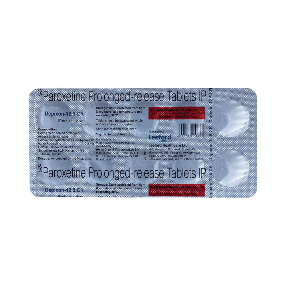 Depixon 12.5 CR Tablet is a type of antidepressant belonging to the selective serotonin reuptake inhibitor (SSRI) group of medicines. It is widely prescribed to treat depression and anxiety-related conditions like obsessive-compulsive disorder, and panic disorder. Depixon 12.5 CR Tablet helps many people to recover from depression by improving their mood and relieving anxiety and tension. It can be taken with or without food. The dose and how often you need it will be decided by your doctor so that you get the right amount to control your symptoms.Your doctor may start you on a lower dose and increase it gradually. Do not change the dose or stop taking it without talking to your doctor, even if you feel well. Doing so may make your condition worse or you may suffer from unpleasant withdrawal symptoms (anxiety, restlessness, palpitations, dizziness, sleep disturbances, etc).To get the most benefit, take this medicine regularly at the same time each day. Your doctor may advise you to take it in the morning if you have trouble sleeping. It may take a few weeks before you start feeling better. Let your doctor know if you do not see any improvement even after 4 weeks.Some common side effects of Depixon 12.5 CR Tablet include nausea, fatigue, dry mouth, loss of appetite, increased sweating, dizziness, nervousness, tremors, insomnia (difficulty in sleeping), and constipation. Sexual side effects like decreased sexual drive, delayed ejaculation, and erectile dysfunction may also be seen. Let your doctor know straight away if you develop any sudden worsening of mood or any thoughts about harming yourself.Before taking this medicine, you should tell your doctor if you have epilepsy (seizure disorder or fits), diabetes, liver or kidney disease, heart problems, or glaucoma. These may affect your treatment. Pregnant or breastfeeding women should also consult their doctor before taking it. Some other medicines may affect the way it works, especially other antidepressants and medicines called MAO inhibitors. Please tell your doctor about all the medicines you are taking to make sure you are safe.