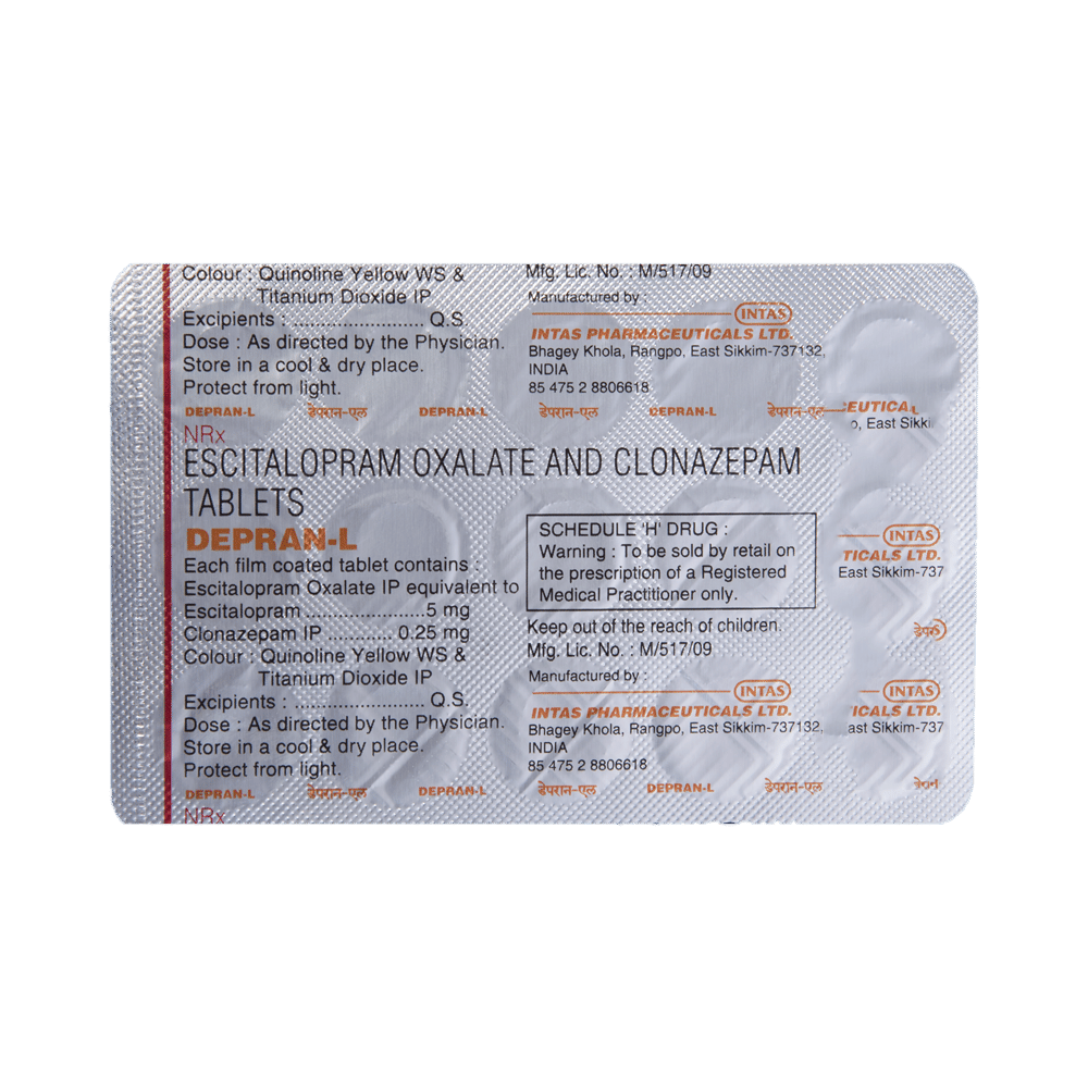 Depran-L Tablet is a prescription medicine used to treat anxiety disorder. It is the combination medicine that calms the brain by decreasing the abnormal and excessive activity of the nerve cells. It also works by increasing the level of a chemical messenger in the brain which improves mood. Depran-L Tablet can be taken with or without food. However, it is advised to take it at the same time each day as this helps to maintain a consistent level of medicine in the body. Take this medicine in the dose and duration advised by your doctor as it has habit-forming potential. If you miss a dose of this medicine, take it as soon as you remember. Finish the full course of treatment even if you feel better. It is important not to stop taking this medicine suddenly as it may cause withdrawal symptoms.Some common side effects of this medicine include delayed ejaculation, low sexual desire, vomiting, memory impairment, depression, and confusion. It may also cause dizziness and sleepiness. So, do not drive or do anything that requires mental focus until you know how this medicine affects you. It may cause weight gain or weight loss depending upon person to person. To prevent weight gain, you can eat a balanced diet and exercise regularly. On the other hand, weight loss can be prevented by increasing food portions in your diet. It is important to inform your doctor if you develop any unusual changes in mood as it can cause suicidal thoughts.Take caution while taking medicine if you are suffering from liver disease. Your doctor should also know about all other medicines you are taking as many of these may make this medicine less effective or change the way it works. Inform your doctor if you are pregnant, planning pregnancy or breastfeeding.