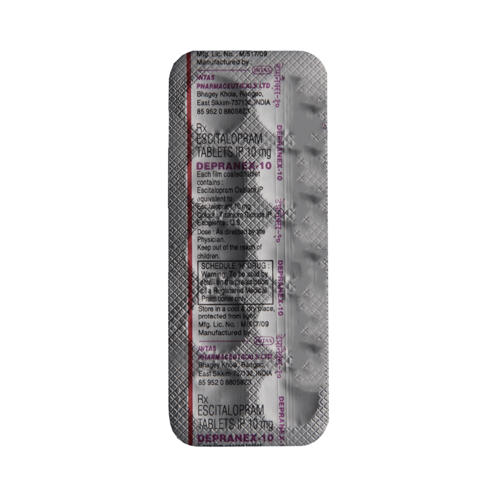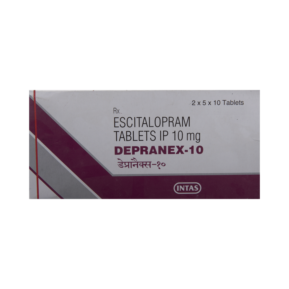 Depranex 10 Tablet is widely prescribed to treat depression and other mental health conditions like anxiety, panic disorder, and obsessive-compulsive disorder. It is a type of antidepressant known as a selective serotonin reuptake inhibitor (SSRI). Depranex 10 Tablet helps recover from depression by improving mood and relieving anxiety and tension. It can be taken with or without food. The dose and how often you need it will be decided by your doctor based on the amount needed to control your symptoms. Your doctor may start you on a lower dose and increase it gradually. Do not change the dose or stop taking it without talking to your doctor, even if you feel well. Doing so may make your condition worse or you may suffer from unpleasant withdrawal symptoms such as anxiety, restlessness, palpitations, dizziness, sleep disturbances.To get the most benefit, take this medicine regularly at the same time each day. Your doctor may advise you to take it in the morning if you have trouble sleeping. It may take a few weeks before you start feeling better. Let your doctor know if you do not see any improvement even after 4 weeks.Some common side effects of this medicine include nausea, fatigue, increased sweating, insomnia (difficulty in sleeping), decreased sexual drive, delayed ejaculation, and women may experience difficulties achieving orgasm. Some people may experience sleepiness after taking this medicine. Let your doctor know straight away if you develop any sudden worsening of mood or any thoughts about harming yourself.Before taking Depranex 10 Tablet, you should tell your doctor if you have epilepsy (seizure disorder or fits), diabetes, liver or kidney disease, any heart problems, or are currently taking medicines for depression known as MAO inhibitors. These may affect your treatment. Please tell your doctor about all the medicines you are taking to make sure you are safe.
