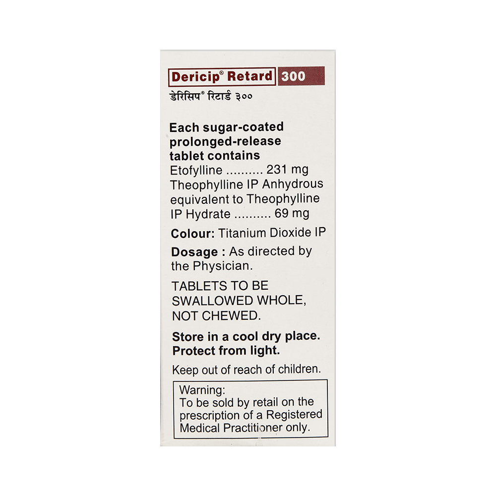 Dericip Retard 300 Tablet PR is used to treat asthma and chronic obstructive pulmonary disorder (a lung disorder in which the flow of air to the lungs is blocked). It helps in relaxing the muscles of the air passages and making it easier to breathe. Dericip Retard 300 Tablet PR is taken without food in a dose and duration as advised by the doctor. The dose you are given will depend on your condition and how you respond to the medicine. You should keep taking this medicine for as long as your doctor recommends. If you stop treatment too early, your symptoms may come back, and your condition may worsen. Let your healthcare team know about all other medications you are taking, as some may affect or be affected by this medicine.The most common side effects are nausea, vomiting, dry mouth, dizziness, stomach upset, headache, and restlessness. Most of these are temporary and usually resolve with time. Contact your doctor straightaway if you are at all concerned about any of these side effects.Before taking this medicine, you should tell your doctor if you have any heart, kidney, or liver diseases so that your doctor can prescribe a suitable dose for you. You should also tell your doctor if you are pregnant, planning pregnancy, or breastfeeding.