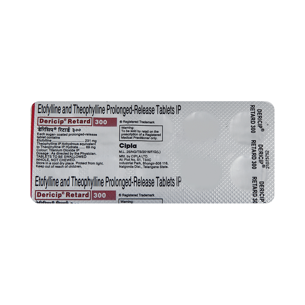 Dericip Retard 300 Tablet PR is a combination of two bronchodilators: Etofylline and Theophylline. They work by relaxing the muscles in the airways and widening them. This makes breathing easier. It also prevents mucus buildup, helping to relieve wheezing, coughing, and shortness of breath.