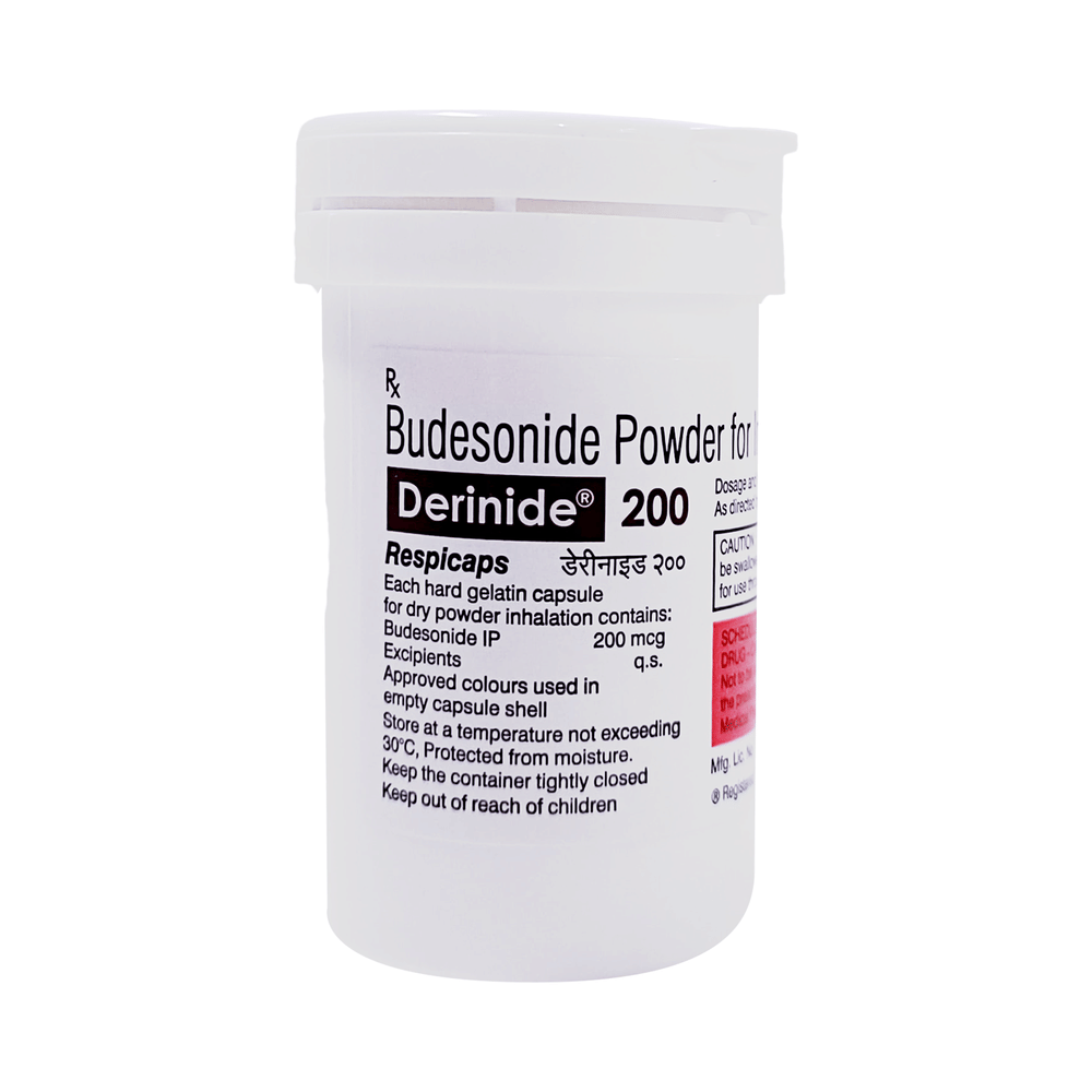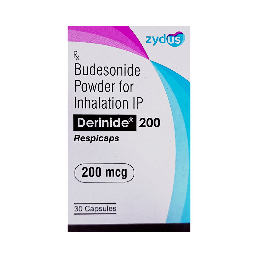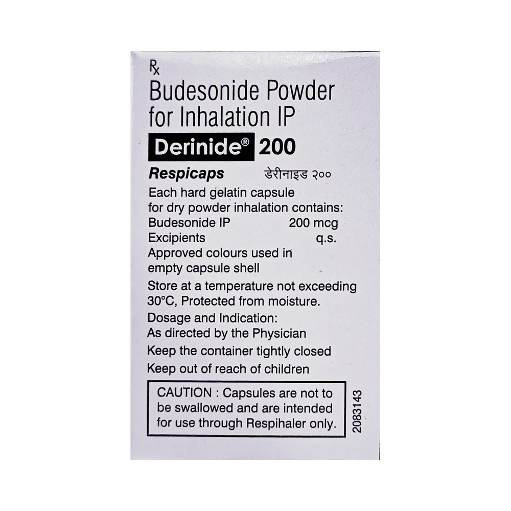 DERinide Respicap is used to prevent the symptoms of asthma (wheezing and shortness of breath). It is a steroid and is known as a "preventer". You need to have a fast-acting “reliever” as well because this medicine will not stop an asthma attack that has already started. Your doctor will tell you how often you need to use DERinide Respicap. It is important that you take the lowest dose needed to effectively control your asthma. The effect of this medicine may be noticeable after a few days but will only reach its maximum after a few weeks. This medicine must be used regularly to be effective, so go on taking it even if you do not have any symptoms. No symptoms mean that the medicine is doing its job. If you stop taking it your asthma may get worse. It should not be used to relieve sudden asthma attacks. If an asthma attack occurs, use your quick-relief inhaler "reliever". To get the benefit from this medicine you need to make sure you get your inhaler technique right, otherwise, it will not work as well.The most common side effects are irritation in the throat, difficulty swallowing, headache, and indigestion. If you get these, do not stop taking it but do talk to your doctor. You can help prevent these symptoms by rinsing your mouth and throat with water or brushing your teeth after using your inhaler. There are other rare, side effects that can be serious. Talk to your doctor if you are worried about them. In general, you should be trying to avoid situations that make your asthma worse (your triggers) and try not to smoke.Before taking DERinide Respicap, you should tell your doctor if you have tuberculosis, any infections in your mouth or lungs, or liver disease. While taking it you may be more at risk of getting infections so stay away from people with colds and flu. If you use DERinide Respicap for a long time it may cause weak bones (osteoporosis) and damage to your eyes (glaucoma or cataracts). You might need tests for bone density and eye pressure. Ask your doctor whether it’s safe to take this medicine if you are pregnant or breastfeeding.