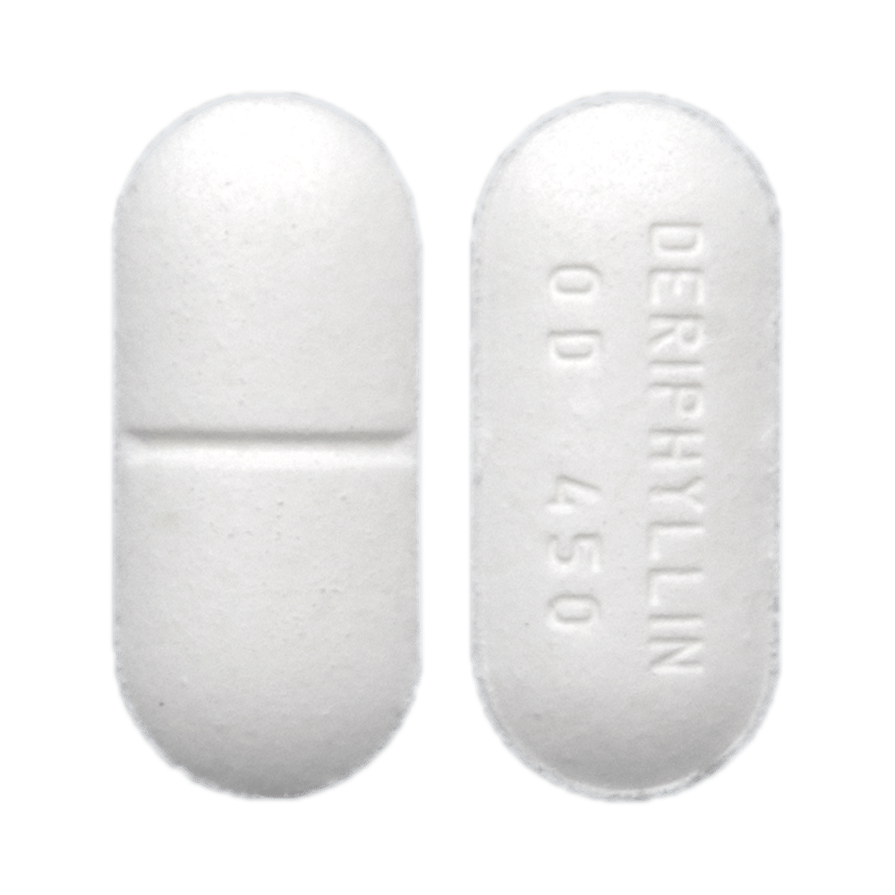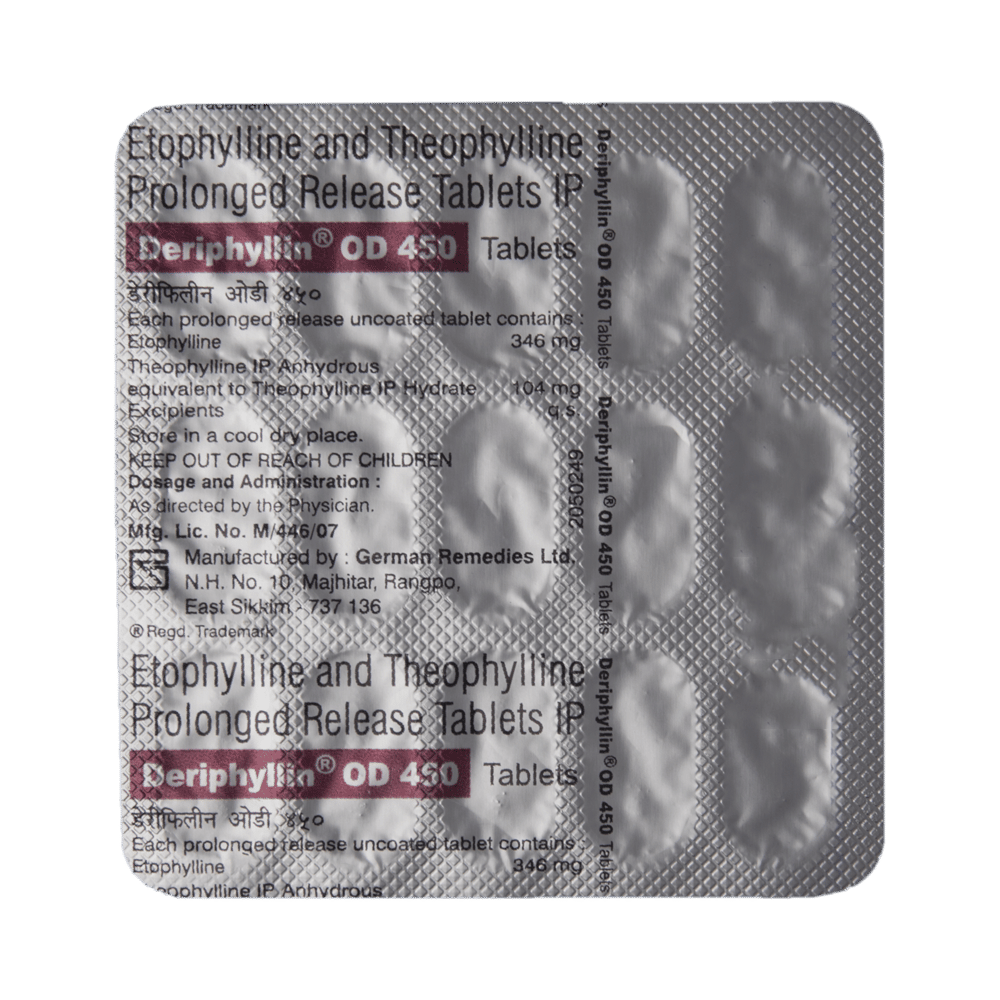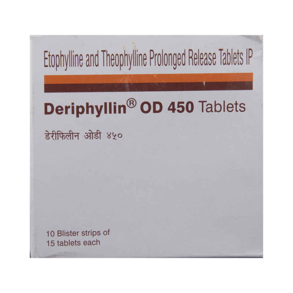 Deriphyllin OD 450 Tablet PR is used to treat asthma and chronic obstructive pulmonary disorder (a lung disorder in which the flow of air to the lungs is blocked). It helps in relaxing the muscles of the air passages and making it easier to breathe. Deriphyllin OD 450 Tablet PR is taken without food in a dose and duration as advised by the doctor. The dose you are given will depend on your condition and how you respond to the medicine. You should keep taking this medicine for as long as your doctor recommends. If you stop treatment too early, your symptoms may come back, and your condition may worsen. Let your healthcare team know about all other medications you are taking, as some may affect or be affected by this medicine.The most common side effects are nausea, vomiting, dry mouth, dizziness, stomach upset, headache, and restlessness. Most of these are temporary and usually resolve with time. Contact your doctor straightaway if you are at all concerned about any of these side effects.Before taking this medicine, you should tell your doctor if you have any heart, kidney, or liver diseases so that your doctor can prescribe a suitable dose for you. You should also tell your doctor if you are pregnant, planning pregnancy, or breastfeeding.