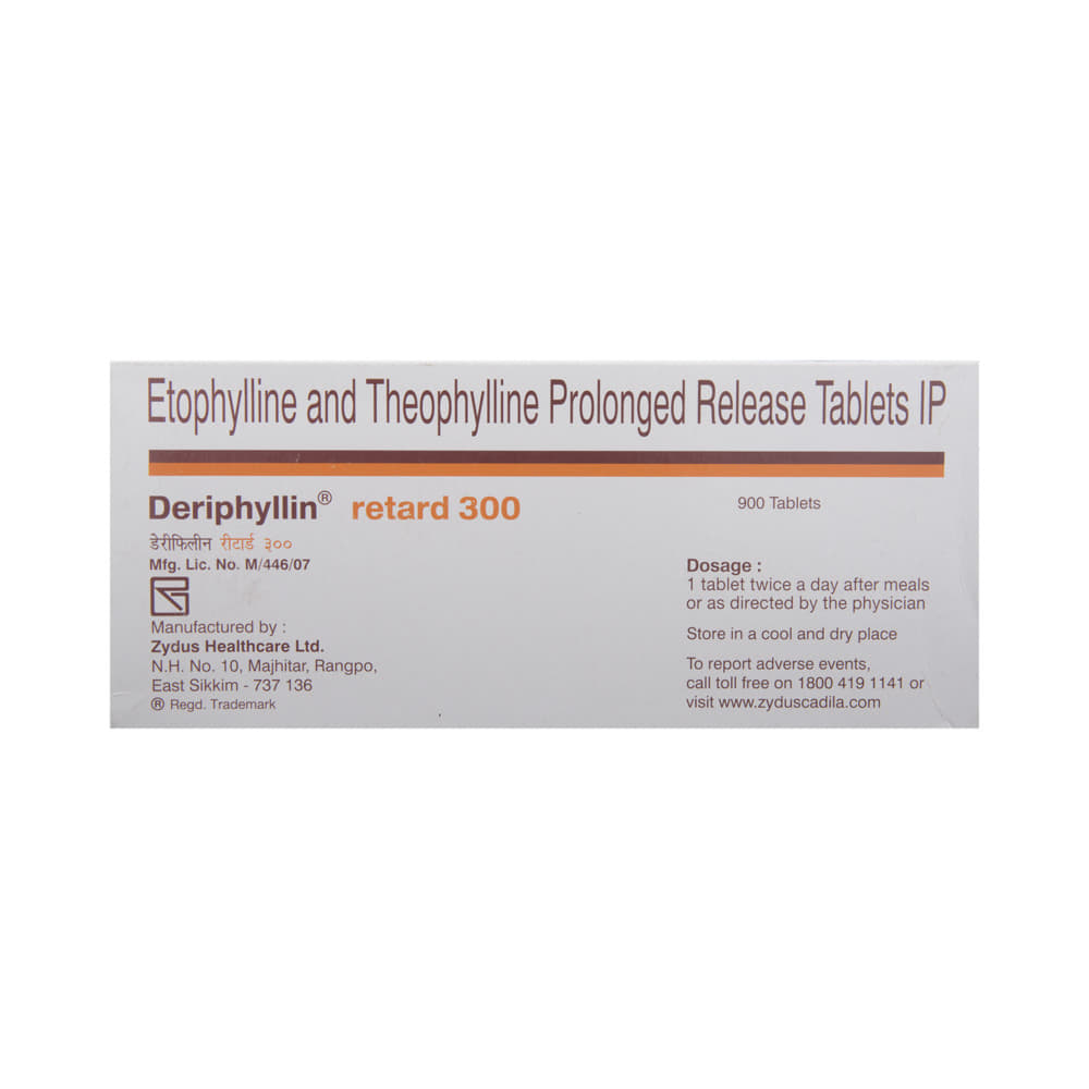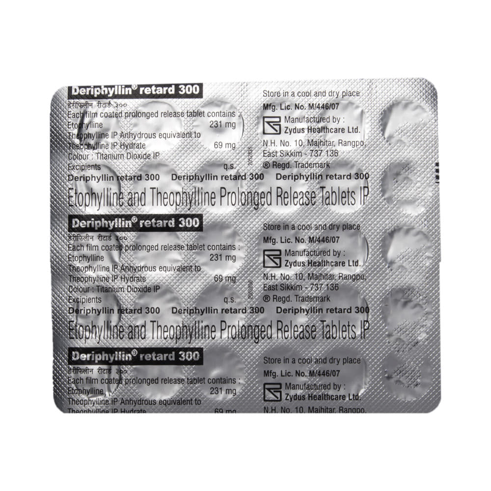 Deriphyllin Retard 300 Tablet PR is used to treat asthma and chronic obstructive pulmonary disorder (a lung disorder in which the flow of air to the lungs is blocked). It helps in relaxing the muscles of the air passages and making it easier to breathe. Deriphyllin Retard 300 Tablet PR is taken without food in a dose and duration as advised by the doctor. The dose you are given will depend on your condition and how you respond to the medicine. You should keep taking this medicine for as long as your doctor recommends. If you stop treatment too early, your symptoms may come back, and your condition may worsen. Let your healthcare team know about all other medications you are taking, as some may affect or be affected by this medicine.The most common side effects are nausea, vomiting, dry mouth, dizziness, stomach upset, headache, and restlessness. Most of these are temporary and usually resolve with time. Contact your doctor straightaway if you are at all concerned about any of these side effects.Before taking this medicine, you should tell your doctor if you have any heart, kidney, or liver diseases so that your doctor can prescribe a suitable dose for you. You should also tell your doctor if you are pregnant, planning pregnancy, or breastfeeding.