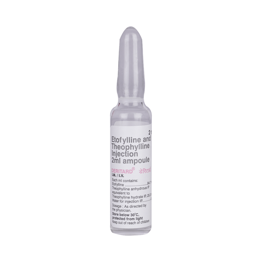 Deritard Injection is used to treat asthma and chronic obstructive pulmonary disorder (a lung disorder in which the flow of air to the lungs is blocked). It helps in relaxing the muscles of the air passages and making it easier to breathe. Deritard Injection is given by your doctor or nurse. The dose you are given will depend on your condition and how you respond to the medicine. You should keep taking this medicine for as long as your doctor recommends. If you stop treatment too early your symptoms may come back and your condition may worsen. Let your healthcare team know about all other medications you are taking as some may affect, or be affected by this medicine.The most common side effects are nausea, vomiting, stomach upset, dry mouth, dizziness, headache, and restlessness. Most of these are temporary and usually resolve with time. Contact your doctor straight away if you are at all concerned about any of these side effects.Before taking this medicine, you should tell your doctor if you have any heart, kidney and liver diseases so that your doctor can prescribe a suitable dose for you. You should also tell your doctor if you are pregnant, planning pregnancy or breastfeeding.