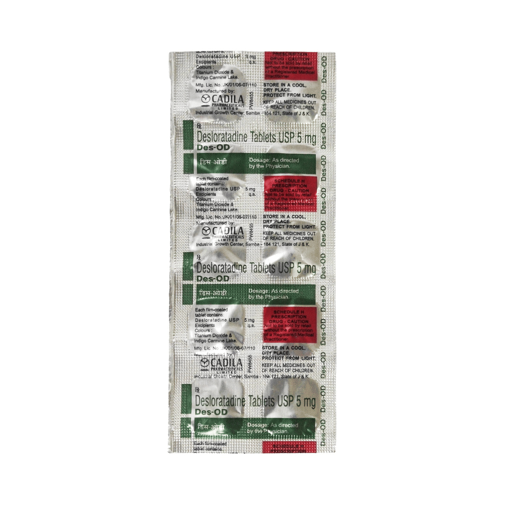 Des-OD Tablet belongs to a group of medicines called antihistamines. It is used in the treatment of various allergic conditions. It relieves symptoms like itching, swelling and rashes. Des-OD Tablet may be taken with or without food. The dose may vary depending on what you are taking it for. Take it as it has been prescribed by your doctor. You may need this medicine only on days you have symptoms, or you may need to take it every day to prevent symptoms from happening. If you stop taking it earlier than advised, your symptoms may come back. This medicine is generally very safe.You may experience dizziness and sleepiness after taking the medicine. These are usually mild and go away after a couple of days as your body adjusts. Consult your doctor if they persist or worry you. Before taking it, you should tell your doctor if you have any problems with your liver or kidneys or with your heart as antihistamines can cause your heart to beat faster.Pregnant or breastfeeding women should also consult with their doctor before taking it. Avoid drinking alcohol as it can cause excessive drowsiness with this medicine. It usually does not impair your ability to drive, but you should not drive if it makes you feel sleepy or dizzy.