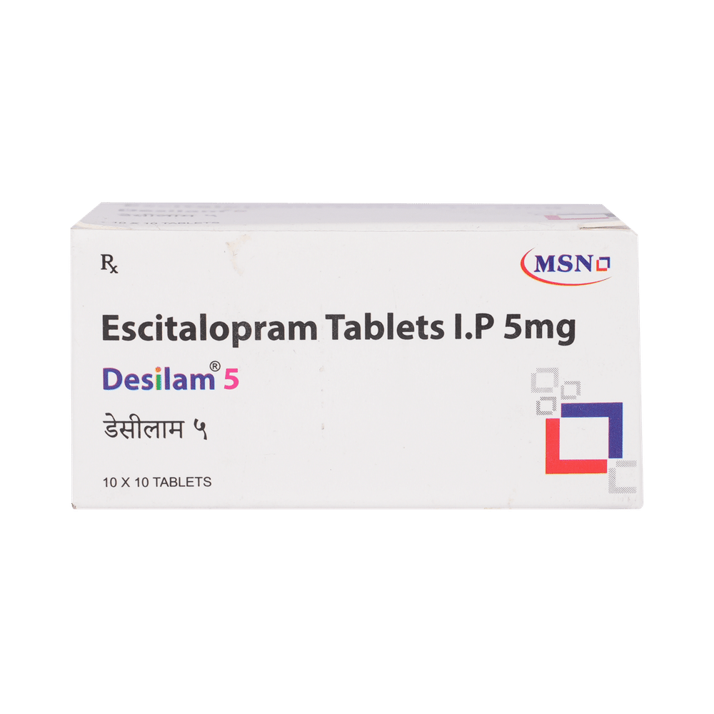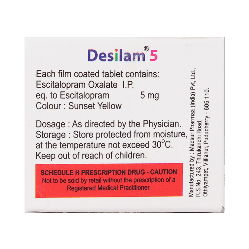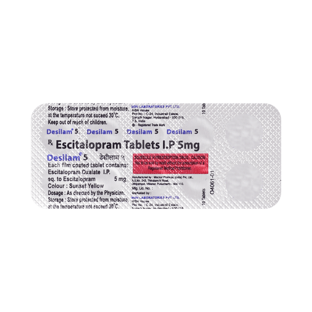 Desilam 5mg Tablet is widely prescribed to treat depression and other mental health conditions like anxiety, panic disorder, and obsessive-compulsive disorder. It is a type of antidepressant known as a selective serotonin reuptake inhibitor (SSRI). Desilam 5mg Tablet helps recover from depression by improving mood and relieving anxiety and tension. It can be taken with or without food. The dose and how often you need it will be decided by your doctor based on the amount needed to control your symptoms. Your doctor may start you on a lower dose and increase it gradually. Do not change the dose or stop taking it without talking to your doctor, even if you feel well. Doing so may make your condition worse or you may suffer from unpleasant withdrawal symptoms such as anxiety, restlessness, palpitations, dizziness, sleep disturbances.To get the most benefit, take this medicine regularly at the same time each day. Your doctor may advise you to take it in the morning if you have trouble sleeping. It may take a few weeks before you start feeling better. Let your doctor know if you do not see any improvement even after 4 weeks.Some common side effects of this medicine include nausea, fatigue, increased sweating, insomnia (difficulty in sleeping), decreased sexual drive, delayed ejaculation, and women may experience difficulties achieving orgasm. Some people may experience sleepiness after taking this medicine. Let your doctor know straight away if you develop any sudden worsening of mood or any thoughts about harming yourself.Before taking Desilam 5mg Tablet, you should tell your doctor if you have epilepsy (seizure disorder or fits), diabetes, liver or kidney disease, any heart problems, or are currently taking medicines for depression known as MAO inhibitors. These may affect your treatment. Please tell your doctor about all the medicines you are taking to make sure you are safe.