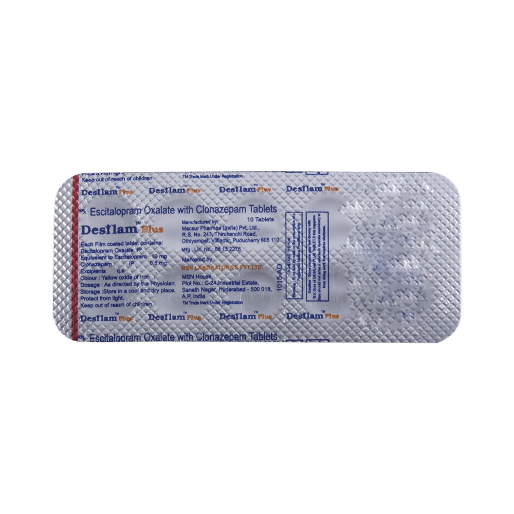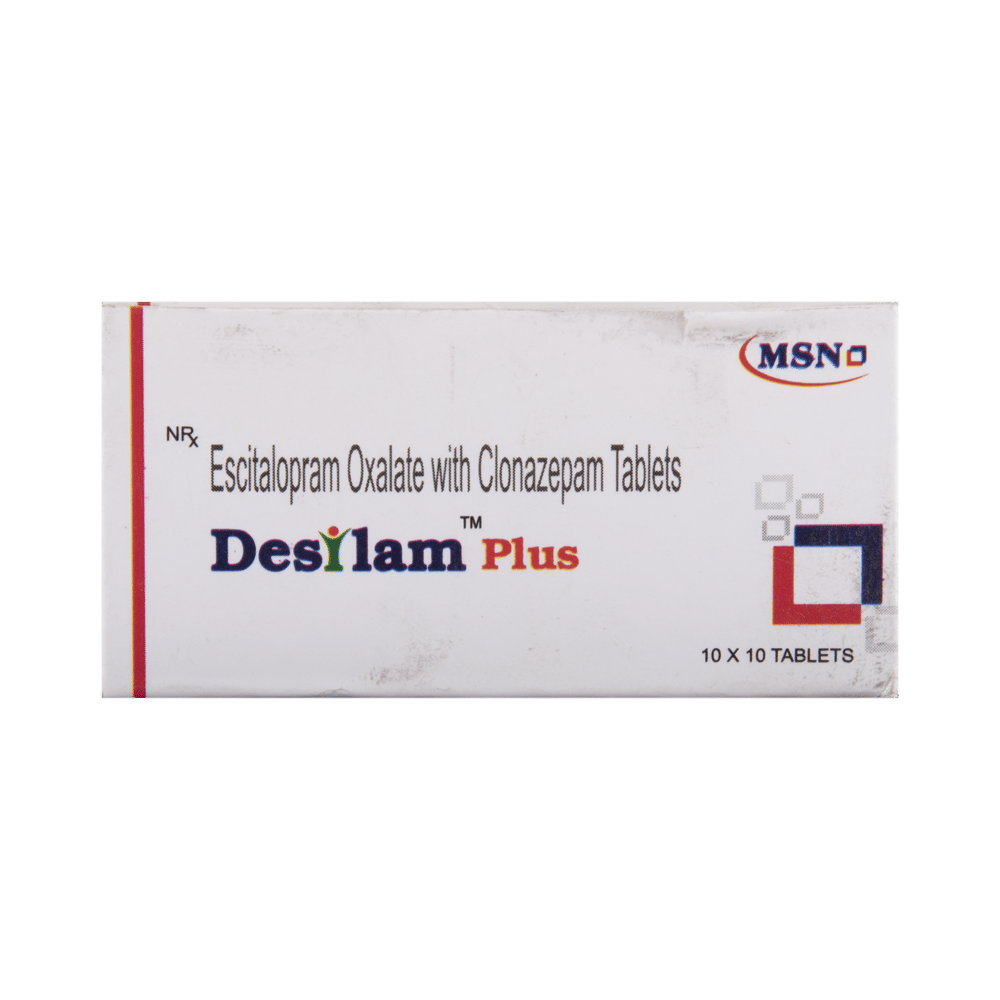 Desilam Plus Tablet is a prescription medicine used to treat anxiety disorder. It is the combination medicine that calms the brain by decreasing the abnormal and excessive activity of the nerve cells. It also works by increasing the level of a chemical messenger in the brain which improves mood. Desilam Plus Tablet can be taken with or without food. However, it is advised to take it at the same time each day as this helps to maintain a consistent level of medicine in the body. Take this medicine in the dose and duration advised by your doctor as it has habit-forming potential. If you miss a dose of this medicine, take it as soon as you remember. Finish the full course of treatment even if you feel better. It is important not to stop taking this medicine suddenly as it may cause withdrawal symptoms.Some common side effects of this medicine include delayed ejaculation, low sexual desire, vomiting, memory impairment, depression, and confusion. It may also cause dizziness and sleepiness. So, do not drive or do anything that requires mental focus until you know how this medicine affects you. It may cause weight gain or weight loss depending upon person to person. To prevent weight gain, you can eat a balanced diet and exercise regularly. On the other hand, weight loss can be prevented by increasing food portions in your diet. It is important to inform your doctor if you develop any unusual changes in mood as it can cause suicidal thoughts.Take caution while taking medicine if you are suffering from liver disease. Your doctor should also know about all other medicines you are taking as many of these may make this medicine less effective or change the way it works. Inform your doctor if you are pregnant, planning pregnancy or breastfeeding.