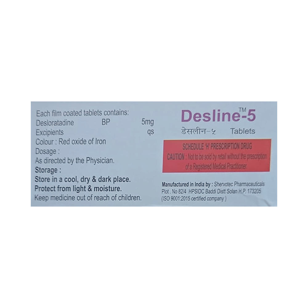 Desline 5 Tablet belongs to a group of medicines called antihistamines. It is used in the treatment of various allergic conditions. It relieves symptoms like itching, swelling and rashes. Desline 5 Tablet may be taken with or without food. The dose may vary depending on what you are taking it for. Take it as it has been prescribed by your doctor. You may need this medicine only on days you have symptoms, or you may need to take it every day to prevent symptoms from happening. If you stop taking it earlier than advised, your symptoms may come back. This medicine is generally very safe.You may experience dizziness and sleepiness after taking the medicine. These are usually mild and go away after a couple of days as your body adjusts. Consult your doctor if they persist or worry you. Before taking it, you should tell your doctor if you have any problems with your liver or kidneys or with your heart as antihistamines can cause your heart to beat faster.Pregnant or breastfeeding women should also consult with their doctor before taking it. Avoid drinking alcohol as it can cause excessive drowsiness with this medicine. It usually does not impair your ability to drive, but you should not drive if it makes you feel sleepy or dizzy.