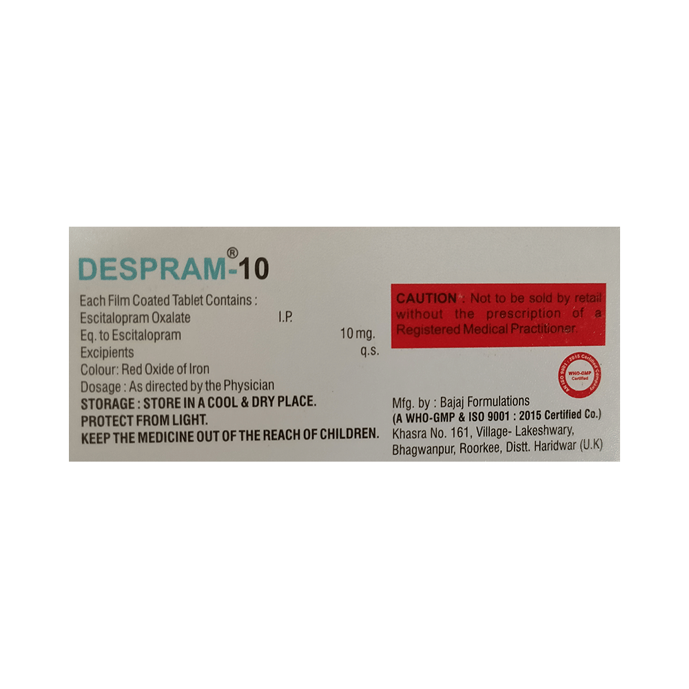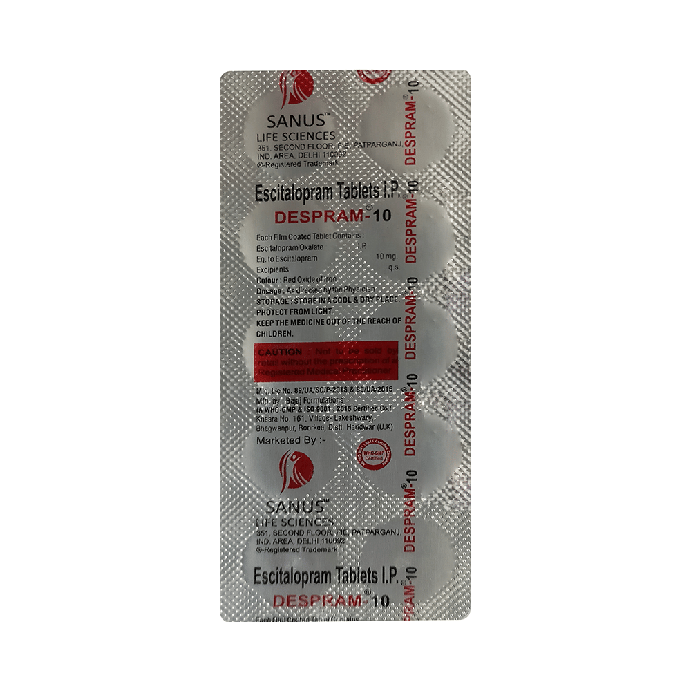 Despram 10 Tablet is widely prescribed to treat depression and other mental health conditions like anxiety, panic disorder, and obsessive-compulsive disorder. It is a type of antidepressant known as a selective serotonin reuptake inhibitor (SSRI). Despram 10 Tablet helps recover from depression by improving mood and relieving anxiety and tension. It can be taken with or without food. The dose and how often you need it will be decided by your doctor based on the amount needed to control your symptoms. Your doctor may start you on a lower dose and increase it gradually. Do not change the dose or stop taking it without talking to your doctor, even if you feel well. Doing so may make your condition worse or you may suffer from unpleasant withdrawal symptoms such as anxiety, restlessness, palpitations, dizziness, sleep disturbances.To get the most benefit, take this medicine regularly at the same time each day. Your doctor may advise you to take it in the morning if you have trouble sleeping. It may take a few weeks before you start feeling better. Let your doctor know if you do not see any improvement even after 4 weeks.Some common side effects of this medicine include nausea, fatigue, increased sweating, insomnia (difficulty in sleeping), decreased sexual drive, delayed ejaculation, and women may experience difficulties achieving orgasm. Some people may experience sleepiness after taking this medicine. Let your doctor know straight away if you develop any sudden worsening of mood or any thoughts about harming yourself.Before taking Despram 10 Tablet, you should tell your doctor if you have epilepsy (seizure disorder or fits), diabetes, liver or kidney disease, any heart problems, or are currently taking medicines for depression known as MAO inhibitors. These may affect your treatment. Please tell your doctor about all the medicines you are taking to make sure you are safe.