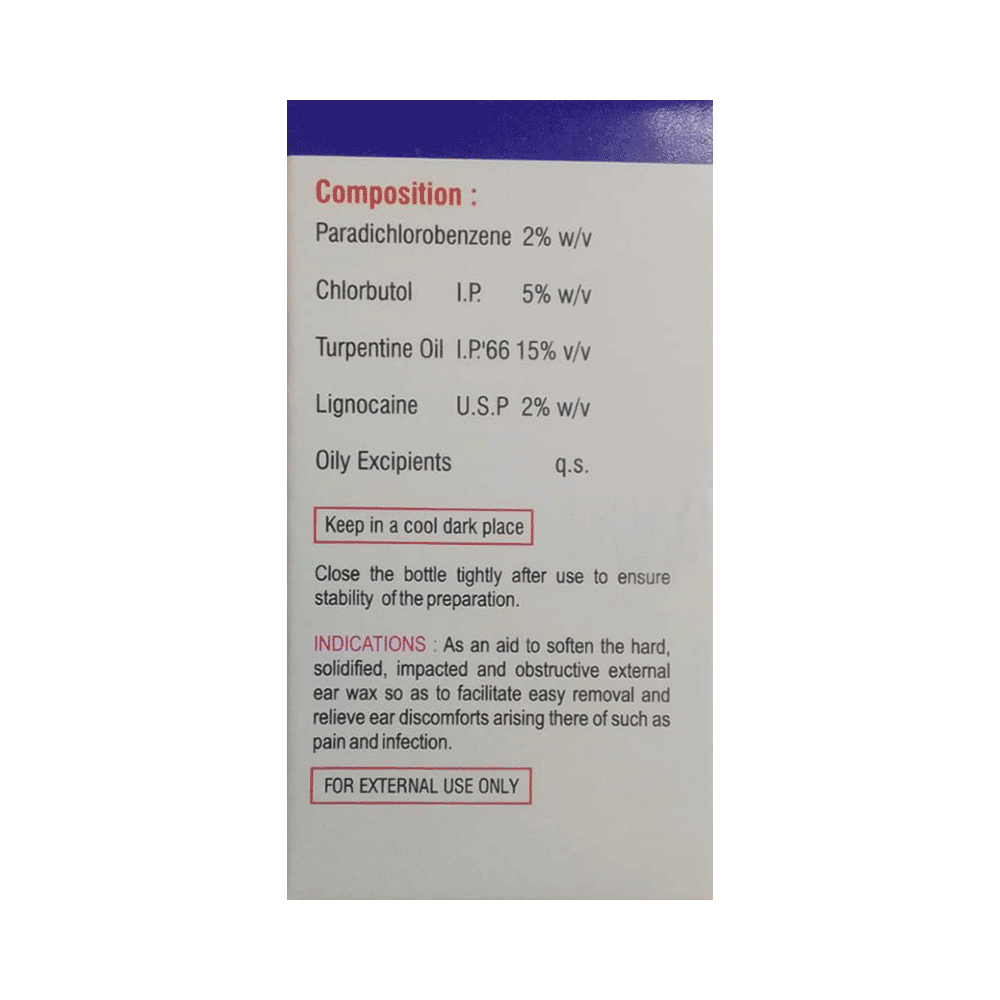 DEwax Ear Drop is a combination of four medicines: Paradichlorobenzene, Chlorbutol, Turpentine Oil and Lidocaine. Paradichlorobenzene works by softening and assisting the removal of hardened ear wax. Chlorbutol is a preservative. Turpentine Oil causes warmth and redness which can help relieve pain in the ear. Lidocaine is a local anesthetic. It works by blocking pain signals from the nerves to brain which decreases sensation of pain.