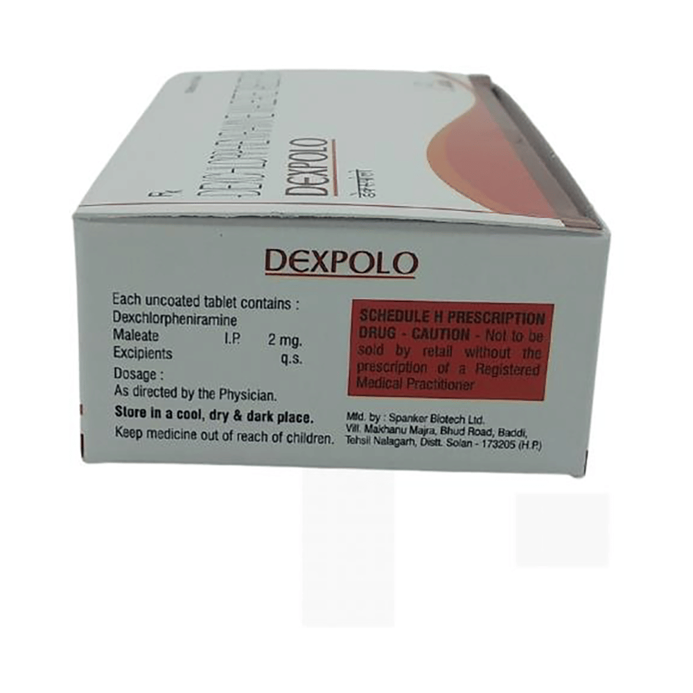 Dexpolo Tablet is an antiallergic medication used in the treatment of various allergic conditions. It provides relief from allergic symptoms such runny nose, sneezing, itching, redness, swelling, and watery eyes. Dexpolo Tablet should be taken with or without food. Take it exactly as prescribed by your doctor. The dose and how often you take it depends on what you are taking it for. Your doctor will decide how much you need to improve your symptoms. You should take this medicine for as long as it is prescribed for you. In case, you missed any doses, take the next dose as soon as you remember it. However, you should never take a double dose.Sleepiness is the most common side effect of this medicine. Avoid driving or attention-seeking activity. If these bother you or appear serious, let your doctor know. There may be ways of reducing or preventing them. In some cases, it may also cause dryness of mouth. To prevent dry mouth, drink plenty of water and maintain good oral hygiene.Before taking this medicine, let your doctor know if you have glaucoma or have any gastro-related issues or have asthma. Inform your doctor if you are pregnant, or breastfeeding. Your doctor should also know about all other medicines you are taking as many of these may make this medicine less effective or change the way it works. Generally, it is advised to avoid alcohol while on treatment.