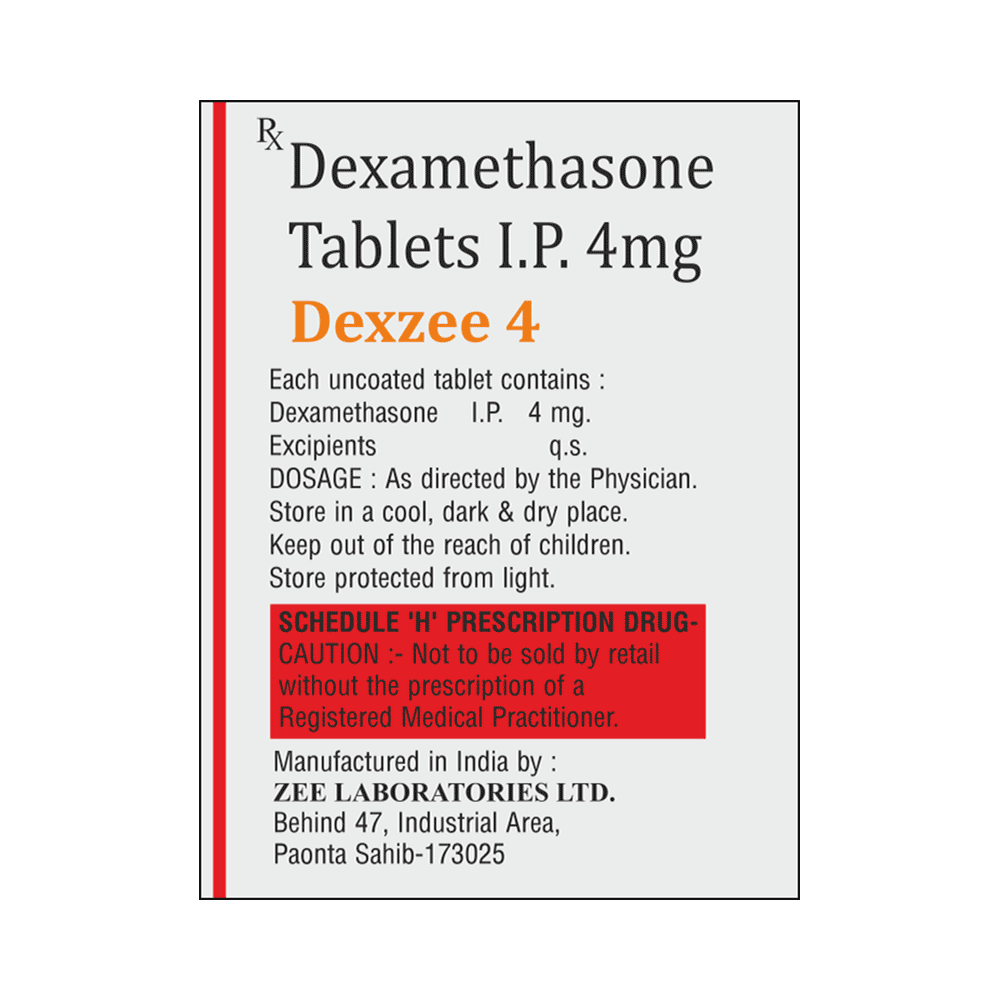 Dexzee 4mg Tablet belongs to a group of medicines called steroids. It is used in the treatment of various diseases and conditions such as inflammatory conditions, autoimmune conditions, and cancer. Dexzee 4mg Tablet provides relief from swelling, redness, pain, and itching in the affected area by preventing the release of substances that cause inflammation. It should be taken with food to avoid stomach upset. Taking the medicine regularly at the right times increases its effectiveness. It is important to keep taking the medicine regularly until your doctor tells you it is safe to stop.The most common side effects of this medicine include cardiovascular complications, electrolyte imbalances, gastrointestinal disorders, metabolic disorders, musculoskeletal pain, neurological disorders, and weight gain. If you experience such symptoms that persist or get worse, let your doctor know.Dexzee 4mg Tablet can make it harder for you to fight off infections. Tell your doctor if you have any signs of infection such as a fever or sore throat. Before taking this medicine, you should let your doctor know all the other medicines you are taking. It is important for pregnant and breastfeeding mothers to ask the advice of their doctors before taking this medicine.