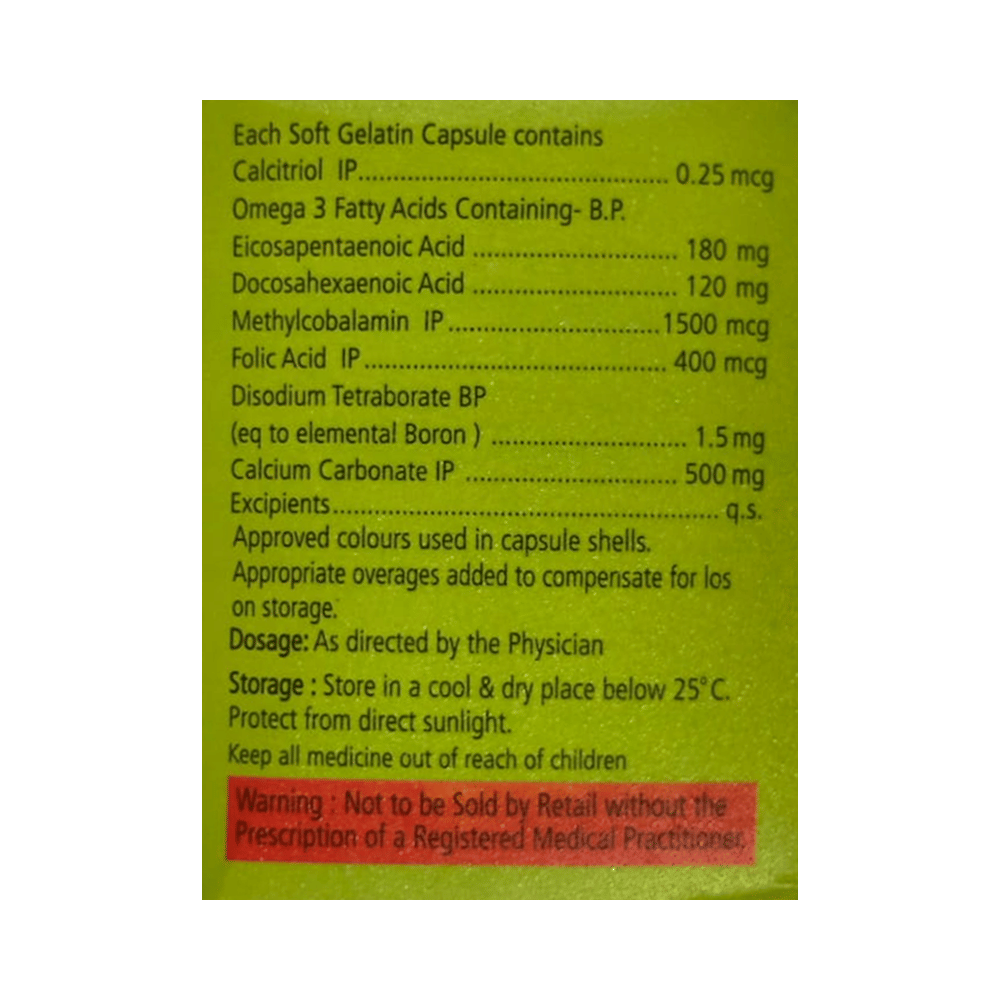 Salt Composition: Eicosapentaenoic Acid (180mg) + Docosahexanoic acid(DHA) (120mg) + Methylcobalamin (1500mcg) + Calcitriol (0.25mcg) + Calcium Carbonate (500mg) + Boron (1.5mg) + Folic Acid (400mcg)