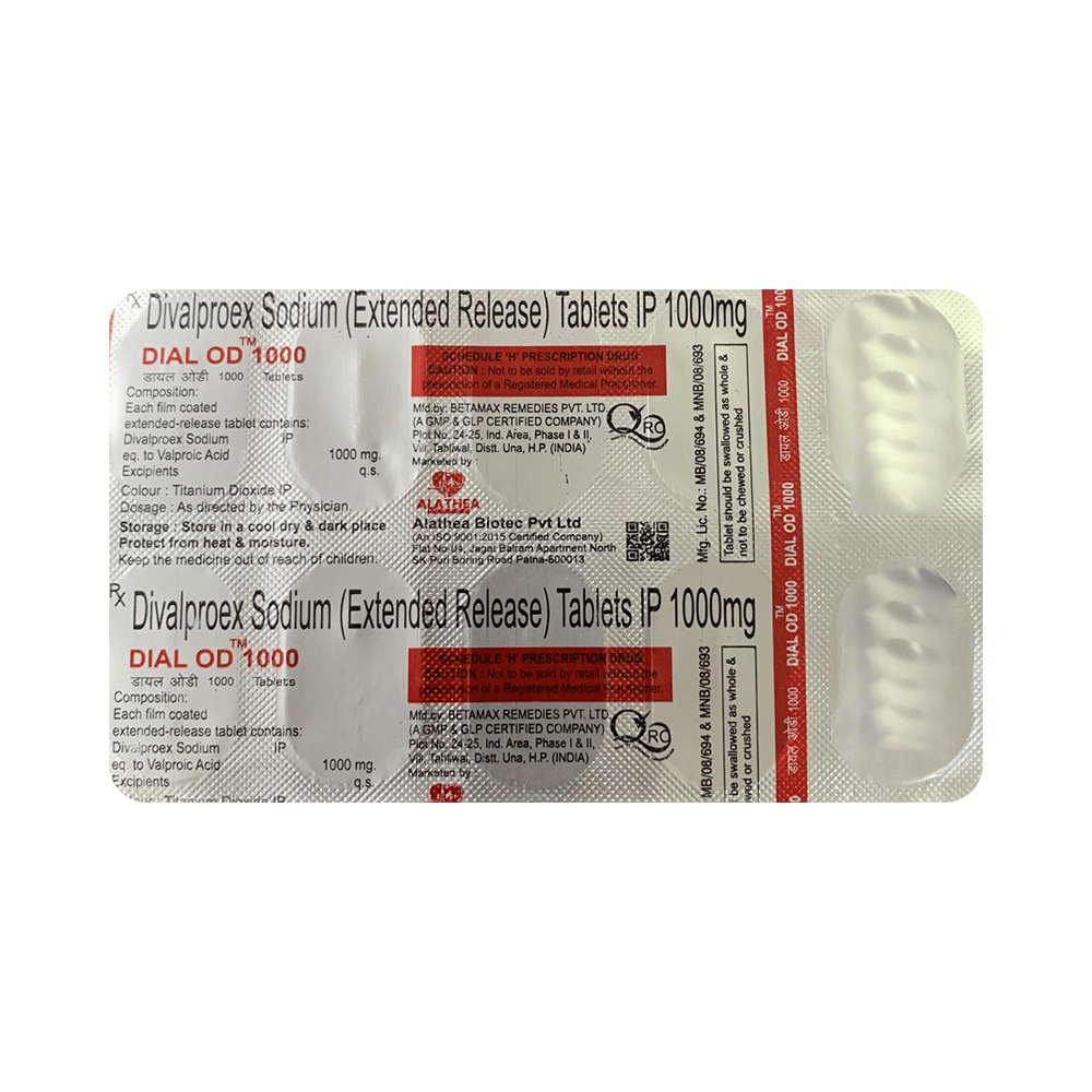 Dial OD 1000 Tablet ER is a medication used to treat epilepsy, seizures, bipolar disorder, mania, trigeminal neuralgia, and migraines. It works by stabilizing brain activity. Always use it under medical supervision for safe and effective treatment. Dial OD 1000 Tablet ER may be used alone or in combination with other medicines. Your doctor will determine the appropriate dose and frequency to effectively control your symptoms. You can take this medicine with or without food, but for the best results, take it at the same time each day. It usually takes a couple of weeks to work. It is important to take this medicine regularly and for as long as you are advised, even if you feel well. Missing doses may trigger seizures, and if you stop, your condition may get worse. It should never be stopped suddenly.The most common side effects of Dial OD 1000 Tablet ER include headache, constipation, nausea, vomiting, dizziness, weight gain, rash, back pain, and abdominal pain. Most of these are not serious. Continue taking the medicine, but consult your doctor if these side effects persist or become bothersome. However, if you notice a skin rash or redness, tell your doctor straight away. Long-term treatment with this medicine can cause osteoporosis (reduced bone mass) and increase your risk of breaking a bone. Also, Dial OD 1000 Tablet ER may rarely lead to suicidal thoughts and behaviors. If your mood becomes depressed, tell your doctor.Dial OD 1000 Tablet ER may not be suitable for everybody. Before using it, tell your doctor if you have ever had heart problems, kidney or liver disease, difficulty urinating, depression, or suicidal thoughts. Some medicines can interfere with it and should not be taken together, so tell your doctor about all the medicines you are taking to make sure it is safe for you. If you are pregnant, do not take this medicine without asking your doctor. Avoid drinking alcohol, as it may enhance certain side effects and increase the risk of seizures. You may need frequent blood tests to help your doctor make sure you are taking the right dose both before you start and while you are using it.