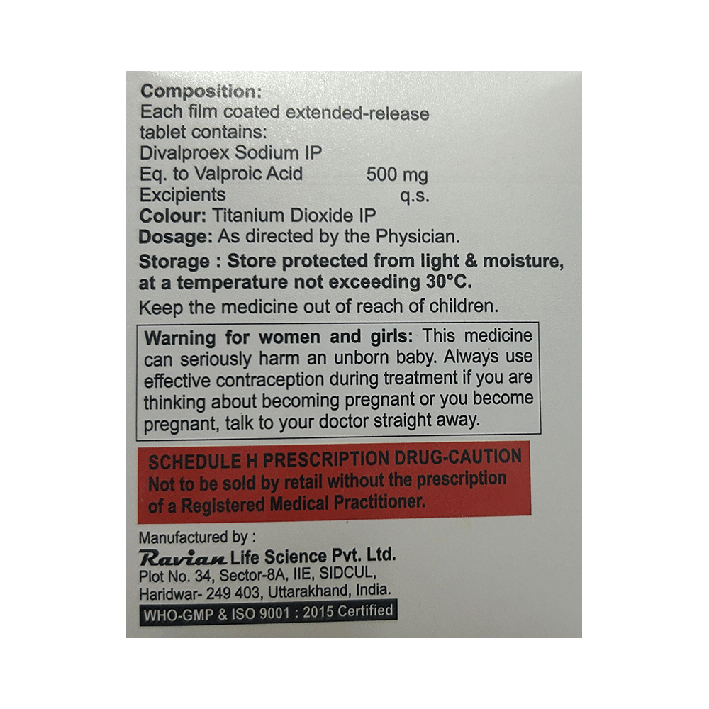 Dicopril ER 500 Tablet is a medication used to treat epilepsy, seizures, bipolar disorder, mania, trigeminal neuralgia, and migraines. It works by stabilizing brain activity. Always use it under medical supervision for safe and effective treatment. Dicopril ER 500 Tablet may be used alone or in combination with other medicines. Your doctor will determine the appropriate dose and frequency to effectively control your symptoms. You can take this medicine with or without food, but for the best results, take it at the same time each day. It usually takes a couple of weeks to work. It is important to take this medicine regularly and for as long as you are advised, even if you feel well. Missing doses may trigger seizures, and if you stop, your condition may get worse. It should never be stopped suddenly.The most common side effects of Dicopril ER 500 Tablet include headache, constipation, nausea, vomiting, dizziness, weight gain, rash, back pain, and abdominal pain. Most of these are not serious. Continue taking the medicine, but consult your doctor if these side effects persist or become bothersome. However, if you notice a skin rash or redness, tell your doctor straight away. Long-term treatment with this medicine can cause osteoporosis (reduced bone mass) and increase your risk of breaking a bone. Also, Dicopril ER 500 Tablet may rarely lead to suicidal thoughts and behaviors. If your mood becomes depressed, tell your doctor.Dicopril ER 500 Tablet may not be suitable for everybody. Before using it, tell your doctor if you have ever had heart problems, kidney or liver disease, difficulty urinating, depression, or suicidal thoughts. Some medicines can interfere with it and should not be taken together, so tell your doctor about all the medicines you are taking to make sure it is safe for you. If you are pregnant, do not take this medicine without asking your doctor. Avoid drinking alcohol, as it may enhance certain side effects and increase the risk of seizures. You may need frequent blood tests to help your doctor make sure you are taking the right dose both before you start and while you are using it.