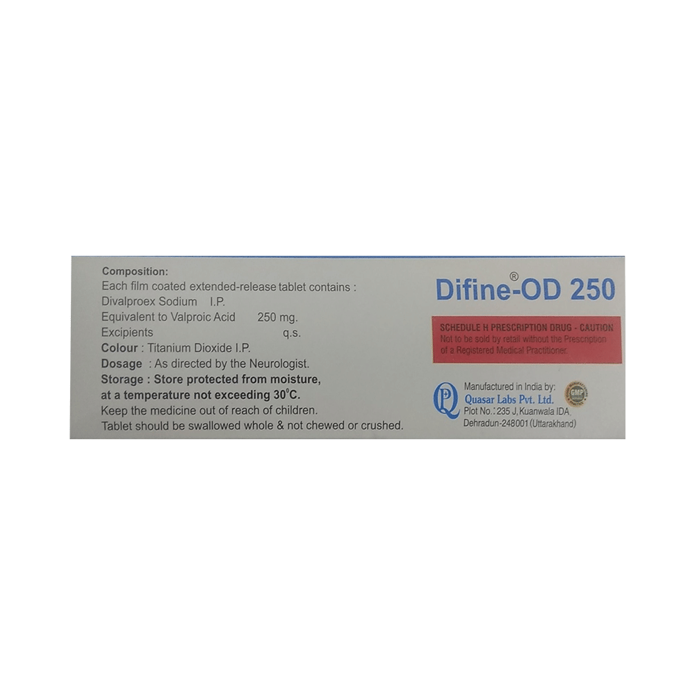 Difine-OD 250 Tablet ER is a medication used to treat epilepsy, seizures, bipolar disorder, mania, trigeminal neuralgia, and migraines. It works by stabilizing brain activity. Always use it under medical supervision for safe and effective treatment. Difine-OD 250 Tablet ER may be used alone or in combination with other medicines. Your doctor will determine the appropriate dose and frequency to effectively control your symptoms. You can take this medicine with or without food, but for the best results, take it at the same time each day. It usually takes a couple of weeks to work. It is important to take this medicine regularly and for as long as you are advised, even if you feel well. Missing doses may trigger seizures, and if you stop, your condition may get worse. It should never be stopped suddenly.The most common side effects of Difine-OD 250 Tablet ER include headache, constipation, nausea, vomiting, dizziness, weight gain, rash, back pain, and abdominal pain. Most of these are not serious. Continue taking the medicine, but consult your doctor if these side effects persist or become bothersome. However, if you notice a skin rash or redness, tell your doctor straight away. Long-term treatment with this medicine can cause osteoporosis (reduced bone mass) and increase your risk of breaking a bone. Also, Difine-OD 250 Tablet ER may rarely lead to suicidal thoughts and behaviors. If your mood becomes depressed, tell your doctor.Difine-OD 250 Tablet ER may not be suitable for everybody. Before using it, tell your doctor if you have ever had heart problems, kidney or liver disease, difficulty urinating, depression, or suicidal thoughts. Some medicines can interfere with it and should not be taken together, so tell your doctor about all the medicines you are taking to make sure it is safe for you. If you are pregnant, do not take this medicine without asking your doctor. Avoid drinking alcohol, as it may enhance certain side effects and increase the risk of seizures. You may need frequent blood tests to help your doctor make sure you are taking the right dose both before you start and while you are using it.