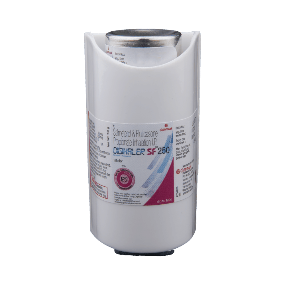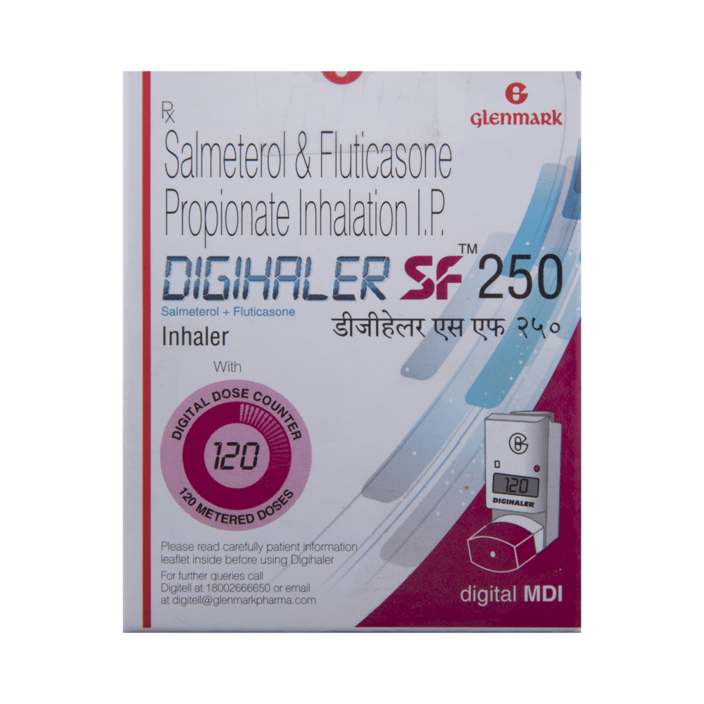 Digihaler SF 250 Inhaler is a combination of two medicines that opens the airways and makes it easier to breathe. It is used in the treatment of asthma (wheezing and shortness of breath) and chronic obstructive pulmonary disorder (a lung disorder in which the flow of air to the lungs is blocked). Your doctor will tell you how often you need to use your inhaler. The effect of this medicine may be noticeable after a few days but will only reach its maximum after a few weeks. This medicine must be used regularly to be effective, so go on taking it even if you don't have any symptoms. That means it’s doing its job. If you stop taking it your asthma and chronic obstructive pulmonary disorder (COPD) may get worse. It should not be used to relieve sudden asthma attacks. If an asthma attack occurs, use your quick-relief inhaler (reliever). To get the benefit from this medicine you need to make sure you get your inhaler technique right, otherwise, it does not work as well.The most common side effects are nausea, vomiting, respiratory tract infection, fungal infections in the mouth, headache, hoarseness of voice, sore throat, cough, musculoskeletal (bone, muscle, or joint) pain, and increased heart rate. If you get there, do not stop taking it but do talk to your doctor. You can help prevent some of these symptoms by rinsing your mouth and throat with water or brushing your teeth after using your inhaler. There are other, rarer side effects that can be serious. Talk to your doctor if you're worried about them. In general, you should be trying to avoid situations that make your asthma worse (your triggers) and try not to smoke.Ask your doctor whether it’s safe to take this medicine if you're pregnant or breastfeeding. Before taking it, you should tell your doctor if you have any kidney or liver diseases so that your doctor can prescribe a suitable dose for you.