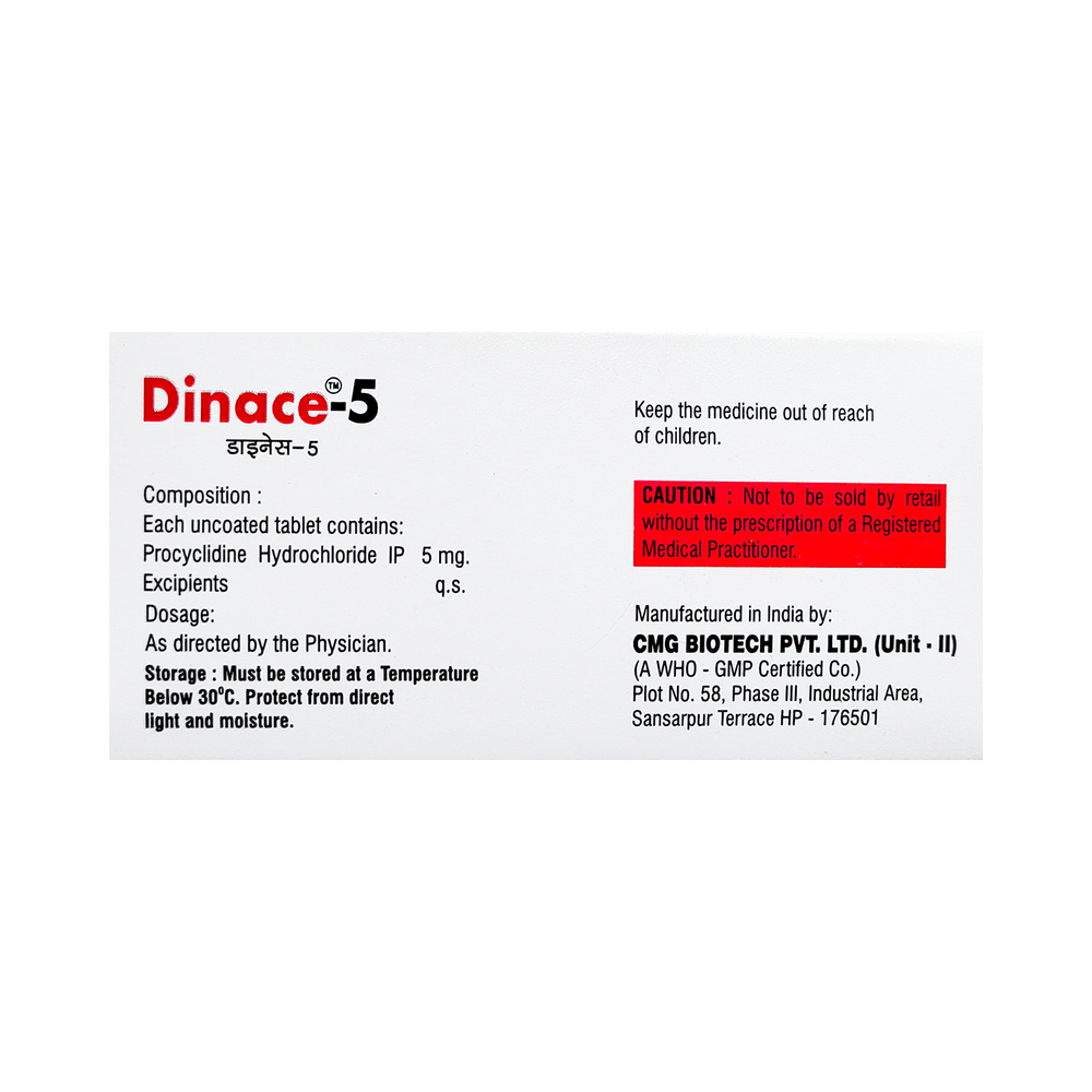 Dinace 5 Tablet is a prescription medicine used in the treatment of Parkinson's disease and drug-induced abnormal movements. It helps by improving muscle control and reducing the stiffness of the muscles so that they can move easily. Dinace 5 Tablet should be taken with food as it reduces the side effects with this medicine. It should be taken at the same time each day, this helps to maintain a consistent level of medicine in the body. Take this medicine in the dose and duration as advised by your doctor and if you have missed a dose, take it as soon as you remember. Do not skip any doses and finish the full course of treatment even if you feel better. This medication mustn't be stopped suddenly without talking to the doctor as it may result in a worsening of symptoms.Some common side effects of this medicine include dilation of the pupil, blurring of vision, lightheadedness, nausea, vomiting, epigastric pain, and constipation. It also causes dizziness, so do not drive or do anything that requires mental focus until you know how this medicine affects you. Dry mouth may occur commonly while using this medicine so, try to do frequent mouth rinses, maintain good oral hygiene, and increase water intake. Avoid wearing contact lenses as it may cause dry eyes as well. It is important to inform your doctor if you suffer from glaucoma or have trouble passing urine.Before using Dinace 5 Tablet, you should tell your doctor if you've ever had heart problems, problems with passing urine, liver or kidney disease. It may also affect, or be affected by, some other drugs you are using so let your doctor know what these are to be safe. Pregnant or breastfeeding mothers should consult their doctor before starting treatment with this medicine.