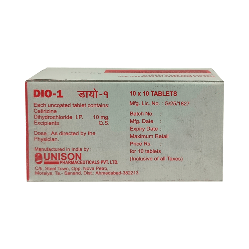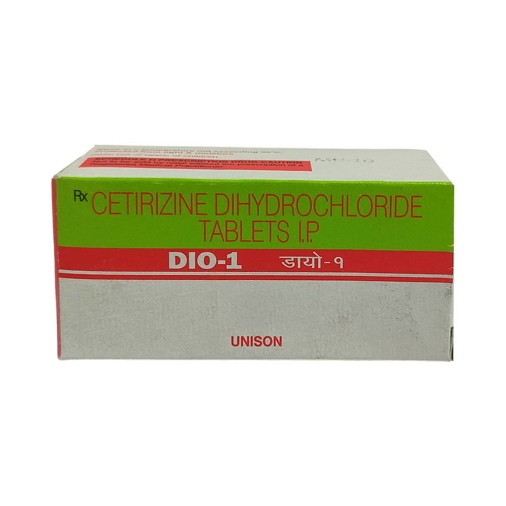 Dio 1 10mg Tablet belongs to a group of medicines called antihistamines. It is used to treat various allergic conditions such as hay fever, conjunctivitis and some skin reactions, and reactions to bites and stings. It relieves watery eyes, runny nose, sneezing, and itching. Dio 1 10mg Tablet can be taken with or without food. The dose required for you may vary depending on what you are taking it for. This medicine is usually taken in the evening but follow the advice of your doctor on how to take it. You may need this medicine only on days you have symptoms, but if you are taking it to prevent symptoms you should take it regularly. If you miss doses or stop taking it earlier than advised, your symptoms may come back.This medicine is generally very safe. The most common side effects include feeling sleepiness, dizziness, tiredness, and sore throat. These are usually mild and go away after a couple of days as your body adjusts. Consult your doctor if any of the side effects persist or worry you. You should avoid alcohol while taking this medicine.Before taking it, tell your doctor if you have any kidney problems or epilepsy. Your dose may need to be modified or this medicine may not be suitable. Some other medicines can interact with this medicine so let your healthcare team know what else you are taking. You should also talk to your doctor before using this medicine if you are pregnant or breastfeeding, although it is not thought to be harmful.