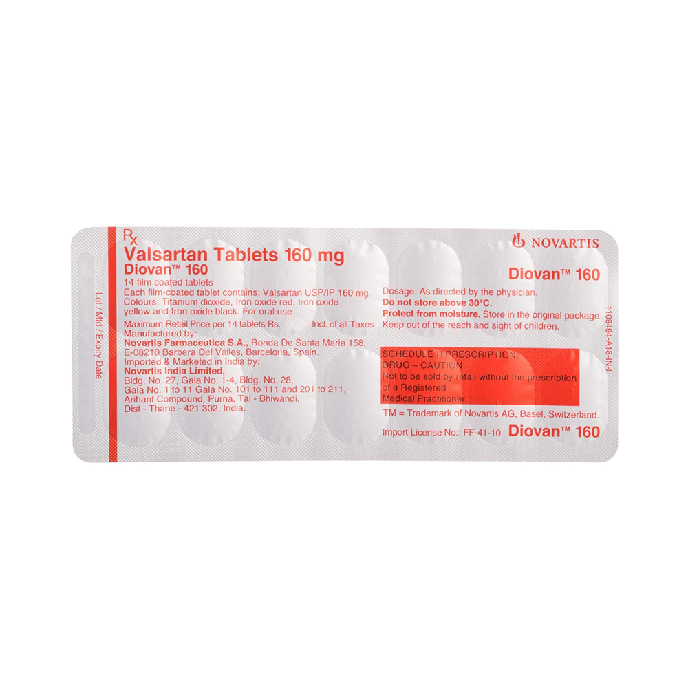 Diovan 160 Tablet is used to treat high blood pressure and heart failure. Lowering blood pressure helps to prevent future heart attacks and stroke. This medicine is also effective in preserving kidney function in patients with diabetes. Diovan 160 Tablet can be prescribed either alone or in combination with other medicines. It may be taken with or without food during the day or at night. However, try to take it at the same time each day to get the most benefit. It is important to continue taking it regularly even if you feel well or if your blood pressure is controlled. Most people with high blood pressure do not feel ill, but if you stop taking this medicine, your condition could get worse. This is a widely used medicine and is considered safe for long-term use.Making some changes in your lifestyle will also help lower your blood pressure. These may include regular exercise, losing weight, smoking cessation, reducing alcohol intake, and reducing the amount of salt in your diet as advised by your doctor. This medicine is tolerated well by most patients and has few side effects. Dizziness, particularly after the first dose, is known to occur in some people. This may be associated with low blood pressure, orthostatic hypotension, and rash. Let your doctor know if these side effects bother you or do not go away. No weight gain has been seen with the regular use of this medicine.Before taking this medicine, let your doctor know if you have any kidney or liver problems. Pregnant or breastfeeding mothers should also consult their doctor before taking it. Your doctor may check your kidney function, blood pressure and potassium levels in your blood at regular intervals while you are taking this medicine.
