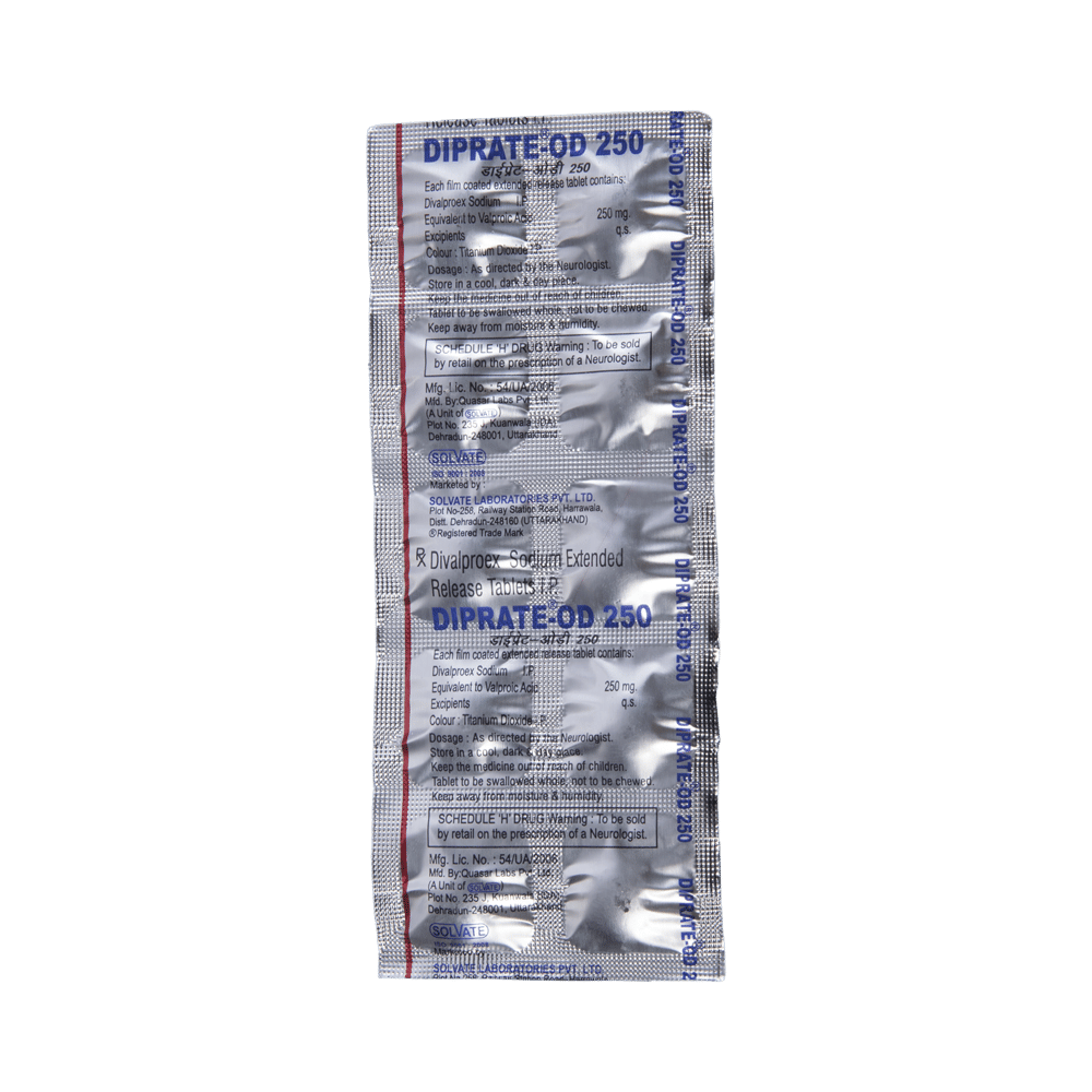 Diprate-OD 250 Tablet ER is a medication used to treat epilepsy, seizures, bipolar disorder, mania, trigeminal neuralgia, and migraines. It works by stabilizing brain activity. Always use it under medical supervision for safe and effective treatment. Diprate-OD 250 Tablet ER may be used alone or in combination with other medicines. Your doctor will determine the appropriate dose and frequency to effectively control your symptoms. You can take this medicine with or without food, but for the best results, take it at the same time each day. It usually takes a couple of weeks to work. It is important to take this medicine regularly and for as long as you are advised, even if you feel well. Missing doses may trigger seizures, and if you stop, your condition may get worse. It should never be stopped suddenly.The most common side effects of Diprate-OD 250 Tablet ER include headache, constipation, nausea, vomiting, dizziness, weight gain, rash, back pain, and abdominal pain. Most of these are not serious. Continue taking the medicine, but consult your doctor if these side effects persist or become bothersome. However, if you notice a skin rash or redness, tell your doctor straight away. Long-term treatment with this medicine can cause osteoporosis (reduced bone mass) and increase your risk of breaking a bone. Also, Diprate-OD 250 Tablet ER may rarely lead to suicidal thoughts and behaviors. If your mood becomes depressed, tell your doctor.Diprate-OD 250 Tablet ER may not be suitable for everybody. Before using it, tell your doctor if you have ever had heart problems, kidney or liver disease, difficulty urinating, depression, or suicidal thoughts. Some medicines can interfere with it and should not be taken together, so tell your doctor about all the medicines you are taking to make sure it is safe for you. If you are pregnant, do not take this medicine without asking your doctor. Avoid drinking alcohol, as it may enhance certain side effects and increase the risk of seizures. You may need frequent blood tests to help your doctor make sure you are taking the right dose both before you start and while you are using it.
