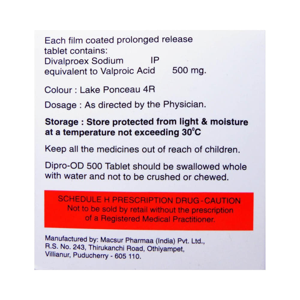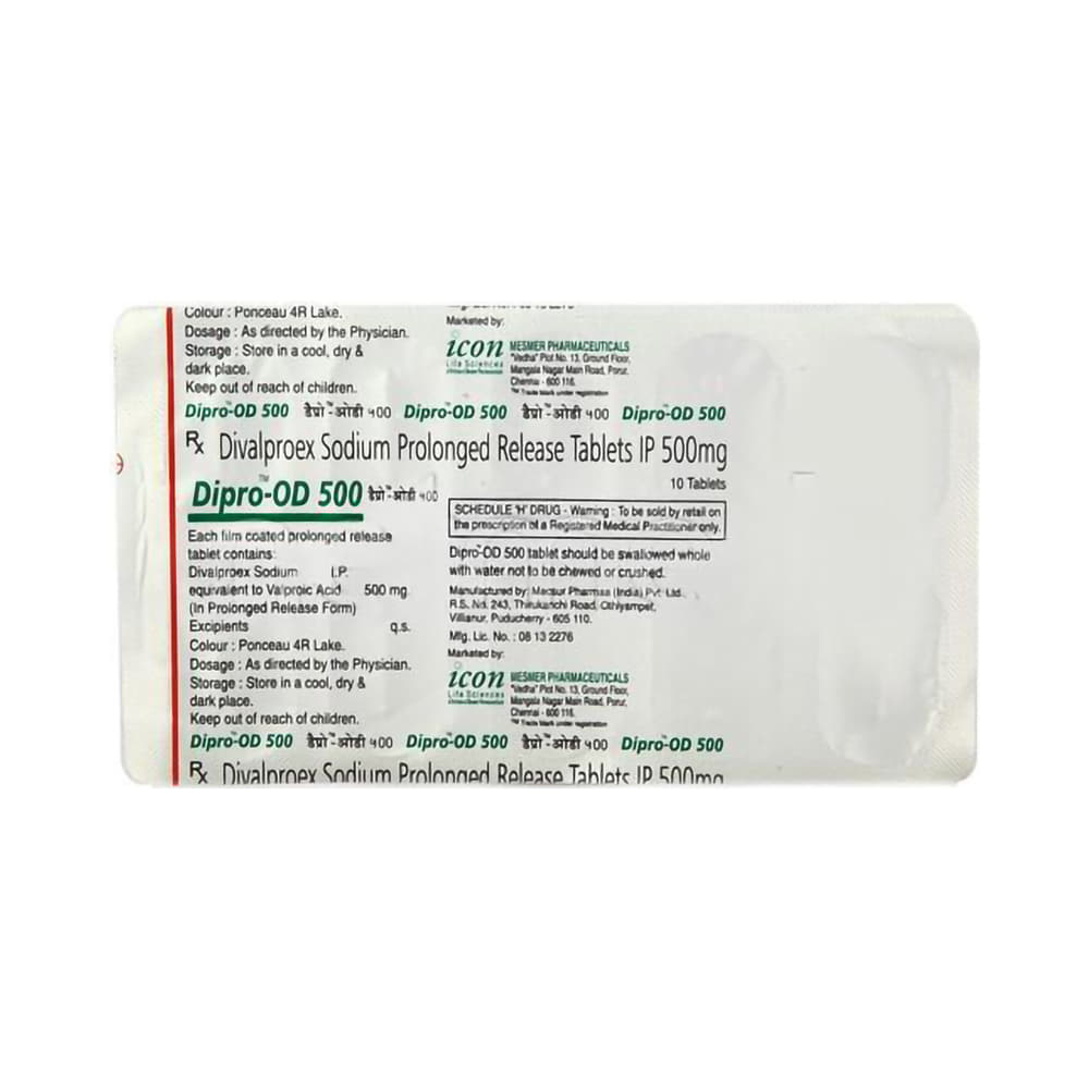 Dipro OD 500mg Tablet is a medication used to treat epilepsy, seizures, bipolar disorder, mania, trigeminal neuralgia, and migraines. It works by stabilizing brain activity. Always use it under medical supervision for safe and effective treatment. Dipro OD 500mg Tablet may be used alone or in combination with other medicines. Your doctor will determine the appropriate dose and frequency to effectively control your symptoms. You can take this medicine with or without food, but for the best results, take it at the same time each day. It usually takes a couple of weeks to work. It is important to take this medicine regularly and for as long as you are advised, even if you feel well. Missing doses may trigger seizures, and if you stop, your condition may get worse. It should never be stopped suddenly.The most common side effects of Dipro OD 500mg Tablet include headache, constipation, nausea, vomiting, dizziness, weight gain, rash, back pain, and abdominal pain. Most of these are not serious. Continue taking the medicine, but consult your doctor if these side effects persist or become bothersome. However, if you notice a skin rash or redness, tell your doctor straight away. Long-term treatment with this medicine can cause osteoporosis (reduced bone mass) and increase your risk of breaking a bone. Also, Dipro OD 500mg Tablet may rarely lead to suicidal thoughts and behaviors. If your mood becomes depressed, tell your doctor.Dipro OD 500mg Tablet may not be suitable for everybody. Before using it, tell your doctor if you have ever had heart problems, kidney or liver disease, difficulty urinating, depression, or suicidal thoughts. Some medicines can interfere with it and should not be taken together, so tell your doctor about all the medicines you are taking to make sure it is safe for you. If you are pregnant, do not take this medicine without asking your doctor. Avoid drinking alcohol, as it may enhance certain side effects and increase the risk of seizures. You may need frequent blood tests to help your doctor make sure you are taking the right dose both before you start and while you are using it.
