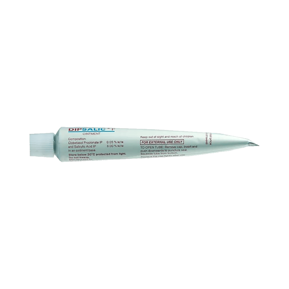 Dipsalic F Ointment has a combination of medicines that are used to treat eczema and psoriasis. It helps to provide relief from redness, itching, and swelling. It removes dead skin cells and helps in softening the skin. Dipsalic F Ointment should be used in the dose and duration as advised by your doctor. Wash your hands before using this medicine. It is advised to check the label for directions before use. It is for external use only.Do not use this medicine more than the recommended dose. Inform your doctor if you have known allergies to this medicine. The common side effects of this medicine include peeling of the skin, thinning of the skin, burning, itching, irritation, and redness at the application site.If these side effects or any other symptoms which you think are because of this medicine persist for a longer duration, please consult your doctor. Inform your doctor if you are pregnant or are suffering from any other disease. This medicine is safe to use in breastfeeding mothers.