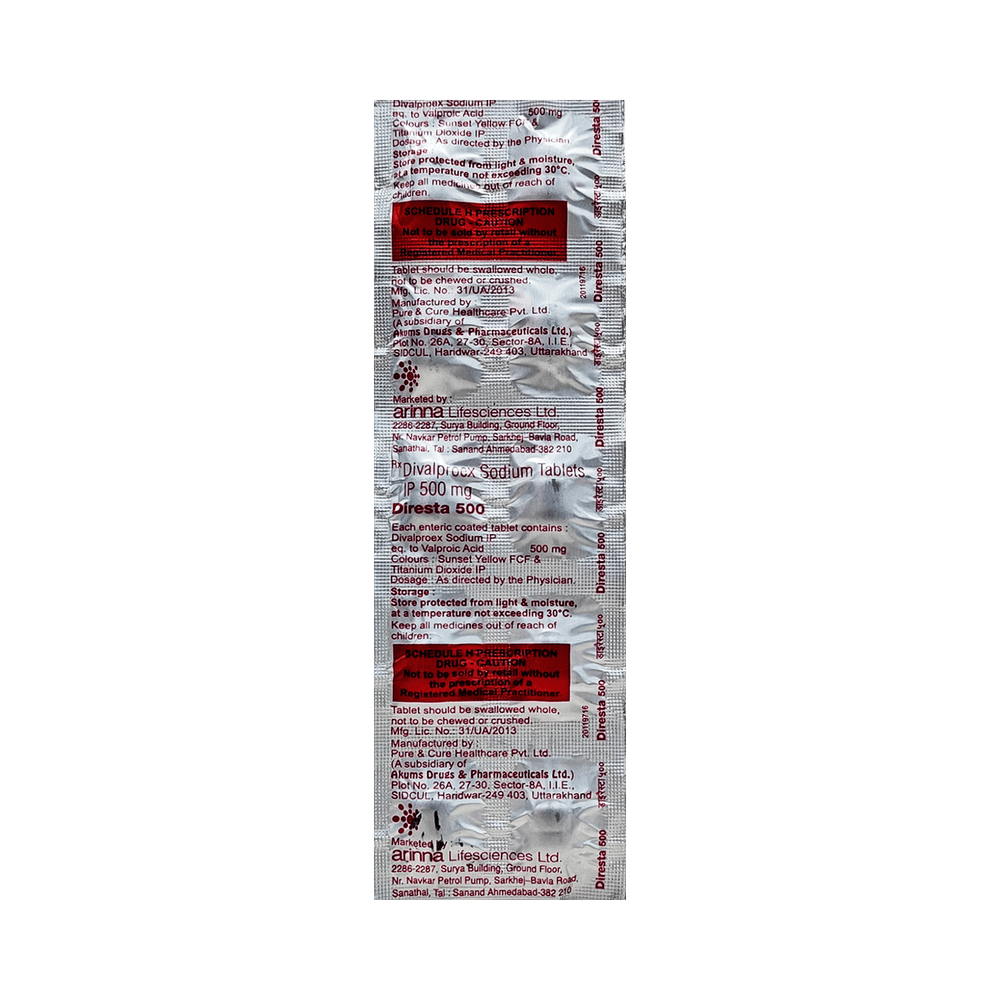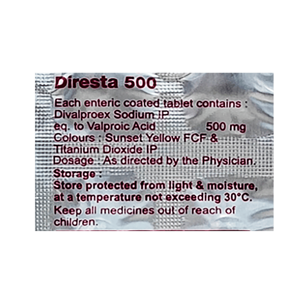 In Treatment of Bipolar disorderDiresta 500mg Tablet works to restore the normal balance of nerve activity in your brain. It can help prevent extreme changes in mood and help you feel less agitated. You may experience fewer episodes of low mood. It can take several weeks for this medicine to work and you may still feel low during this time. It is likely that you will take this medicine for at least six months but possibly much longer. It needs to be taken regularly to work effectively. Do not stop taking it unless your doctor advises you to. You should continue to eat well and keep fit to reduce symptoms of bipolar disorder.In Treatment of Epilepsy/SeizuresDiresta 500mg Tablet is an anticonvulsant (or anti-epileptic) medicine that works by decreasing the nerve impulses which cause the seizures. By controlling the frequency of seizures, it will help you go about your daily activities with more confidence. It helps reduce symptoms such as confusion, uncontrollable jerking movements, loss of awareness, and fear or anxiety.This medicine is not associated with any physical or psychological dependence (addiction) but it should not be stopped suddenly. It must be taken regularly as prescribed to be effective. Missing doses may trigger a seizure.show moreshow less