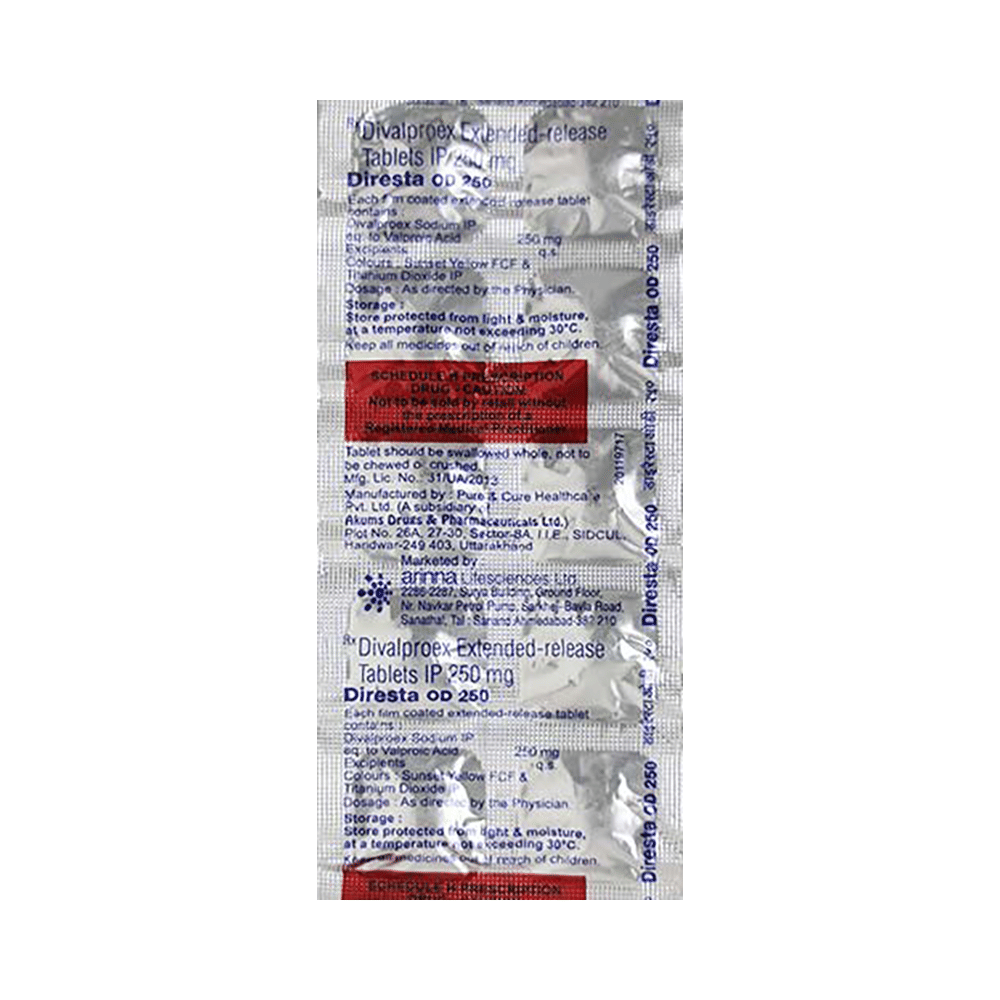 In Treatment of Bipolar disorderDiresta OD 250 Tablet ER works to restore the normal balance of nerve activity in your brain. It can help prevent extreme changes in mood and help you feel less agitated. You may experience fewer episodes of low mood. It can take several weeks for this medicine to work and you may still feel low during this time. It is likely that you will take this medicine for at least six months but possibly much longer. It needs to be taken regularly to work effectively. Do not stop taking it unless your doctor advises you to. You should continue to eat well and keep fit to reduce symptoms of bipolar disorder.In Treatment of Epilepsy/SeizuresDiresta OD 250 Tablet ER is an anticonvulsant (or anti-epileptic) medicine that works by decreasing the nerve impulses which cause the seizures. By controlling the frequency of seizures, it will help you go about your daily activities with more confidence. It helps reduce symptoms such as confusion, uncontrollable jerking movements, loss of awareness, and fear or anxiety.This medicine is not associated with any physical or psychological dependence (addiction) but it should not be stopped suddenly. It must be taken regularly as prescribed to be effective. Missing doses may trigger a seizure.show moreshow less