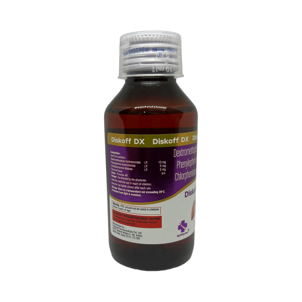 Diskoff DX Syrup Cherry No Added Sugar is a combination of three medicines: Phenylephrine, Chlorpheniramine Maleate, and Dextromethorphan Hydrobromide. Phenylephrine is a decongestant which narrows the small blood vessels providing relief from congestion or stuffiness in the nose. Chlorpheniramine Maleate is an antiallergic which relieves allergy symptoms like runny nose, watery eyes and sneezing. Dextromethorphan Hydrobromide is a cough suppressant which relieves cough by reducing the activity of cough center in the brain.