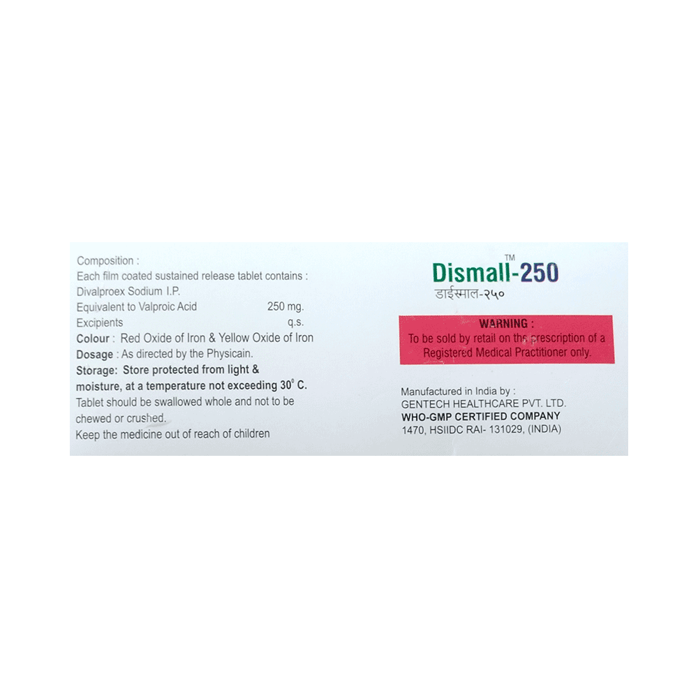 Dismall 250 Tablet SR is a medication used to treat epilepsy, seizures, bipolar disorder, mania, trigeminal neuralgia, and migraines. It works by stabilizing brain activity. Always use it under medical supervision for safe and effective treatment. Dismall 250 Tablet SR may be used alone or in combination with other medicines. Your doctor will determine the appropriate dose and frequency to effectively control your symptoms. You can take this medicine with or without food, but for the best results, take it at the same time each day. It usually takes a couple of weeks to work. It is important to take this medicine regularly and for as long as you are advised, even if you feel well. Missing doses may trigger seizures, and if you stop, your condition may get worse. It should never be stopped suddenly.The most common side effects of Dismall 250 Tablet SR include headache, constipation, nausea, vomiting, dizziness, weight gain, rash, back pain, and abdominal pain. Most of these are not serious. Continue taking the medicine, but consult your doctor if these side effects persist or become bothersome. However, if you notice a skin rash or redness, tell your doctor straight away. Long-term treatment with this medicine can cause osteoporosis (reduced bone mass) and increase your risk of breaking a bone. Also, Dismall 250 Tablet SR may rarely lead to suicidal thoughts and behaviors. If your mood becomes depressed, tell your doctor.Dismall 250 Tablet SR may not be suitable for everybody. Before using it, tell your doctor if you have ever had heart problems, kidney or liver disease, difficulty urinating, depression, or suicidal thoughts. Some medicines can interfere with it and should not be taken together, so tell your doctor about all the medicines you are taking to make sure it is safe for you. If you are pregnant, do not take this medicine without asking your doctor. Avoid drinking alcohol, as it may enhance certain side effects and increase the risk of seizures. You may need frequent blood tests to help your doctor make sure you are taking the right dose both before you start and while you are using it.