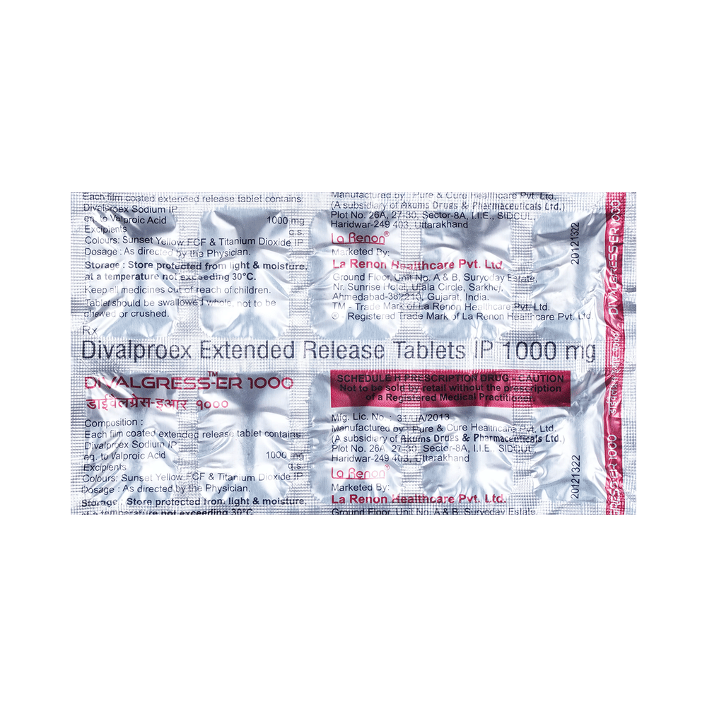 Divalgress 1000mg Tablet ER is a medication used to treat epilepsy, seizures, bipolar disorder, mania, trigeminal neuralgia, and migraines. It works by stabilizing brain activity. Always use it under medical supervision for safe and effective treatment. Divalgress 1000mg Tablet ER may be used alone or in combination with other medicines. Your doctor will determine the appropriate dose and frequency to effectively control your symptoms. You can take this medicine with or without food, but for the best results, take it at the same time each day. It usually takes a couple of weeks to work. It is important to take this medicine regularly and for as long as you are advised, even if you feel well. Missing doses may trigger seizures, and if you stop, your condition may get worse. It should never be stopped suddenly.The most common side effects of Divalgress 1000mg Tablet ER include headache, constipation, nausea, vomiting, dizziness, weight gain, rash, back pain, and abdominal pain. Most of these are not serious. Continue taking the medicine, but consult your doctor if these side effects persist or become bothersome. However, if you notice a skin rash or redness, tell your doctor straight away. Long-term treatment with this medicine can cause osteoporosis (reduced bone mass) and increase your risk of breaking a bone. Also, Divalgress 1000mg Tablet ER may rarely lead to suicidal thoughts and behaviors. If your mood becomes depressed, tell your doctor.Divalgress 1000mg Tablet ER may not be suitable for everybody. Before using it, tell your doctor if you have ever had heart problems, kidney or liver disease, difficulty urinating, depression, or suicidal thoughts. Some medicines can interfere with it and should not be taken together, so tell your doctor about all the medicines you are taking to make sure it is safe for you. If you are pregnant, do not take this medicine without asking your doctor. Avoid drinking alcohol, as it may enhance certain side effects and increase the risk of seizures. You may need frequent blood tests to help your doctor make sure you are taking the right dose both before you start and while you are using it.