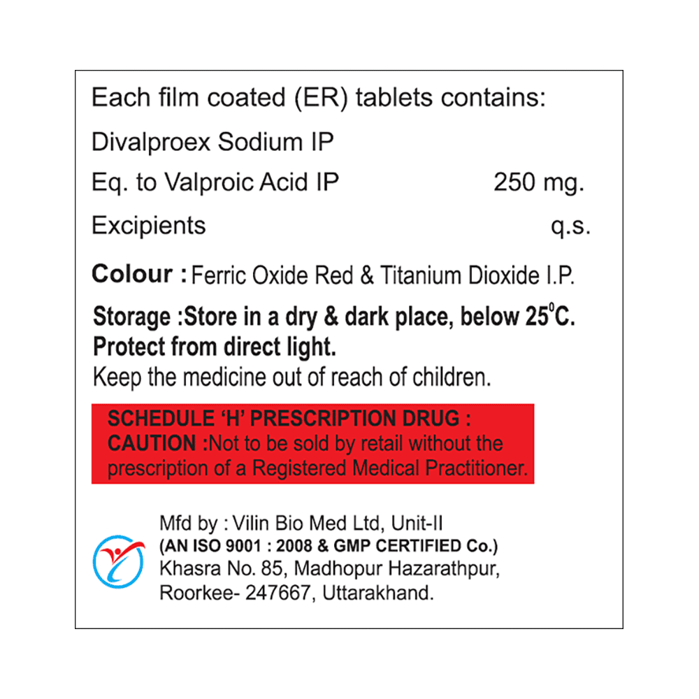 Divalna-ER 250 Tablet is a medication used to treat epilepsy, seizures, bipolar disorder, mania, trigeminal neuralgia, and migraines. It works by stabilizing brain activity. Always use it under medical supervision for safe and effective treatment. Divalna-ER 250 Tablet may be used alone or in combination with other medicines. Your doctor will determine the appropriate dose and frequency to effectively control your symptoms. You can take this medicine with or without food, but for the best results, take it at the same time each day. It usually takes a couple of weeks to work. It is important to take this medicine regularly and for as long as you are advised, even if you feel well. Missing doses may trigger seizures, and if you stop, your condition may get worse. It should never be stopped suddenly.The most common side effects of Divalna-ER 250 Tablet include headache, constipation, nausea, vomiting, dizziness, weight gain, rash, back pain, and abdominal pain. Most of these are not serious. Continue taking the medicine, but consult your doctor if these side effects persist or become bothersome. However, if you notice a skin rash or redness, tell your doctor straight away. Long-term treatment with this medicine can cause osteoporosis (reduced bone mass) and increase your risk of breaking a bone. Also, Divalna-ER 250 Tablet may rarely lead to suicidal thoughts and behaviors. If your mood becomes depressed, tell your doctor.Divalna-ER 250 Tablet may not be suitable for everybody. Before using it, tell your doctor if you have ever had heart problems, kidney or liver disease, difficulty urinating, depression, or suicidal thoughts. Some medicines can interfere with it and should not be taken together, so tell your doctor about all the medicines you are taking to make sure it is safe for you. If you are pregnant, do not take this medicine without asking your doctor. Avoid drinking alcohol, as it may enhance certain side effects and increase the risk of seizures. You may need frequent blood tests to help your doctor make sure you are taking the right dose both before you start and while you are using it.