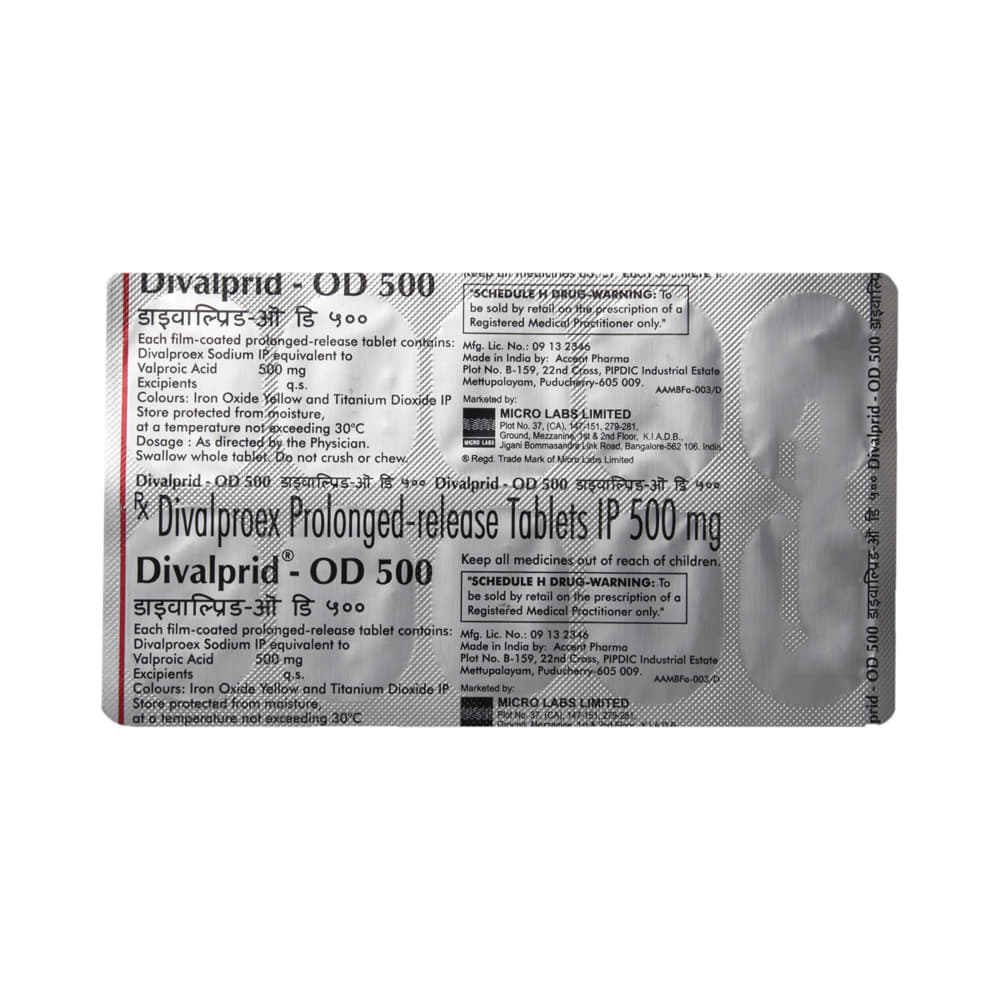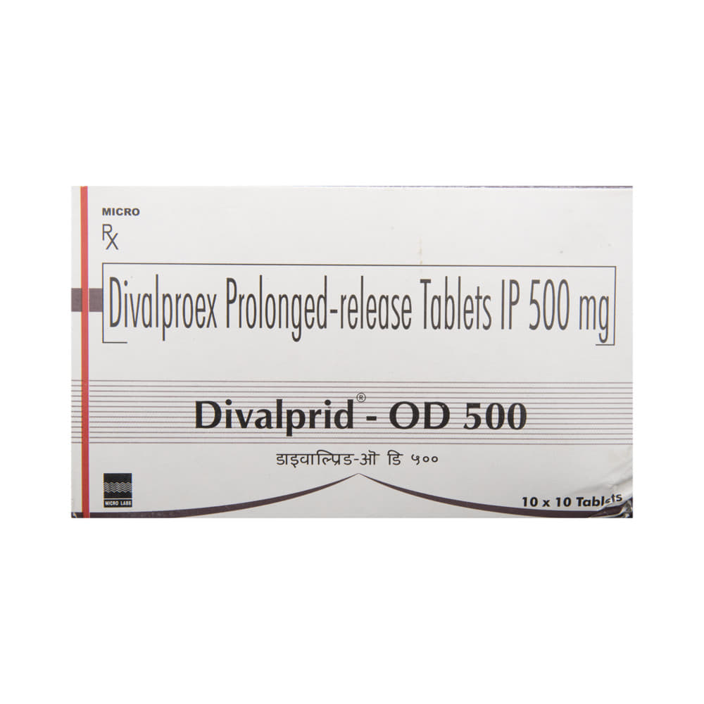 Divalprid-OD 500 Tablet PR is a medication used to treat epilepsy, seizures, bipolar disorder, mania, trigeminal neuralgia, and migraines. It works by stabilizing brain activity. Always use it under medical supervision for safe and effective treatment. Divalprid-OD 500 Tablet PR may be used alone or in combination with other medicines. Your doctor will determine the appropriate dose and frequency to effectively control your symptoms. You can take this medicine with or without food, but for the best results, take it at the same time each day. It usually takes a couple of weeks to work. It is important to take this medicine regularly and for as long as you are advised, even if you feel well. Missing doses may trigger seizures, and if you stop, your condition may get worse. It should never be stopped suddenly.The most common side effects of Divalprid-OD 500 Tablet PR include headache, constipation, nausea, vomiting, dizziness, weight gain, rash, back pain, and abdominal pain. Most of these are not serious. Continue taking the medicine, but consult your doctor if these side effects persist or become bothersome. However, if you notice a skin rash or redness, tell your doctor straight away. Long-term treatment with this medicine can cause osteoporosis (reduced bone mass) and increase your risk of breaking a bone. Also, Divalprid-OD 500 Tablet PR may rarely lead to suicidal thoughts and behaviors. If your mood becomes depressed, tell your doctor.Divalprid-OD 500 Tablet PR may not be suitable for everybody. Before using it, tell your doctor if you have ever had heart problems, kidney or liver disease, difficulty urinating, depression, or suicidal thoughts. Some medicines can interfere with it and should not be taken together, so tell your doctor about all the medicines you are taking to make sure it is safe for you. If you are pregnant, do not take this medicine without asking your doctor. Avoid drinking alcohol, as it may enhance certain side effects and increase the risk of seizures. You may need frequent blood tests to help your doctor make sure you are taking the right dose both before you start and while you are using it.