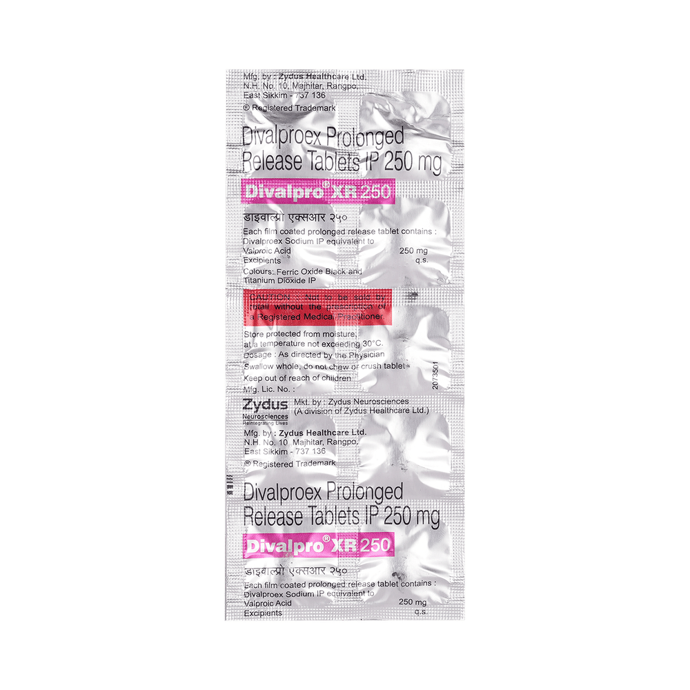 Divalpro XR 250 Tablet is a medication used to treat epilepsy, seizures, bipolar disorder, mania, trigeminal neuralgia, and migraines. It works by stabilizing brain activity. Always use it under medical supervision for safe and effective treatment. Divalpro XR 250 Tablet may be used alone or in combination with other medicines. Your doctor will determine the appropriate dose and frequency to effectively control your symptoms. You can take this medicine with or without food, but for the best results, take it at the same time each day. It usually takes a couple of weeks to work. It is important to take this medicine regularly and for as long as you are advised, even if you feel well. Missing doses may trigger seizures, and if you stop, your condition may get worse. It should never be stopped suddenly.The most common side effects of Divalpro XR 250 Tablet include headache, constipation, nausea, vomiting, dizziness, weight gain, rash, back pain, and abdominal pain. Most of these are not serious. Continue taking the medicine, but consult your doctor if these side effects persist or become bothersome. However, if you notice a skin rash or redness, tell your doctor straight away. Long-term treatment with this medicine can cause osteoporosis (reduced bone mass) and increase your risk of breaking a bone. Also, Divalpro XR 250 Tablet may rarely lead to suicidal thoughts and behaviors. If your mood becomes depressed, tell your doctor.Divalpro XR 250 Tablet may not be suitable for everybody. Before using it, tell your doctor if you have ever had heart problems, kidney or liver disease, difficulty urinating, depression, or suicidal thoughts. Some medicines can interfere with it and should not be taken together, so tell your doctor about all the medicines you are taking to make sure it is safe for you. If you are pregnant, do not take this medicine without asking your doctor. Avoid drinking alcohol, as it may enhance certain side effects and increase the risk of seizures. You may need frequent blood tests to help your doctor make sure you are taking the right dose both before you start and while you are using it.