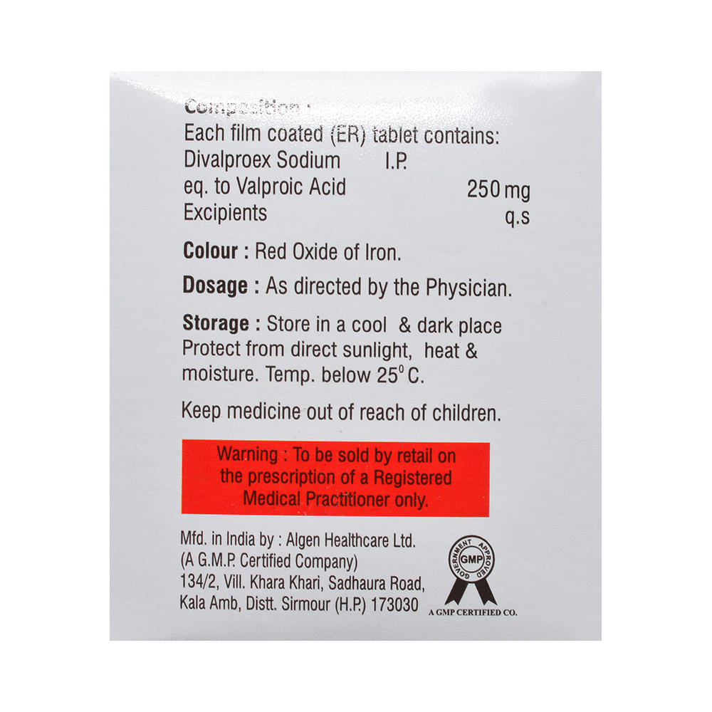 Divalton OD 250 Tablet ER is a medication used to treat epilepsy, seizures, bipolar disorder, mania, trigeminal neuralgia, and migraines. It works by stabilizing brain activity. Always use it under medical supervision for safe and effective treatment. Divalton OD 250 Tablet ER may be used alone or in combination with other medicines. Your doctor will determine the appropriate dose and frequency to effectively control your symptoms. You can take this medicine with or without food, but for the best results, take it at the same time each day. It usually takes a couple of weeks to work. It is important to take this medicine regularly and for as long as you are advised, even if you feel well. Missing doses may trigger seizures, and if you stop, your condition may get worse. It should never be stopped suddenly.The most common side effects of Divalton OD 250 Tablet ER include headache, constipation, nausea, vomiting, dizziness, weight gain, rash, back pain, and abdominal pain. Most of these are not serious. Continue taking the medicine, but consult your doctor if these side effects persist or become bothersome. However, if you notice a skin rash or redness, tell your doctor straight away. Long-term treatment with this medicine can cause osteoporosis (reduced bone mass) and increase your risk of breaking a bone. Also, Divalton OD 250 Tablet ER may rarely lead to suicidal thoughts and behaviors. If your mood becomes depressed, tell your doctor.Divalton OD 250 Tablet ER may not be suitable for everybody. Before using it, tell your doctor if you have ever had heart problems, kidney or liver disease, difficulty urinating, depression, or suicidal thoughts. Some medicines can interfere with it and should not be taken together, so tell your doctor about all the medicines you are taking to make sure it is safe for you. If you are pregnant, do not take this medicine without asking your doctor. Avoid drinking alcohol, as it may enhance certain side effects and increase the risk of seizures. You may need frequent blood tests to help your doctor make sure you are taking the right dose both before you start and while you are using it.