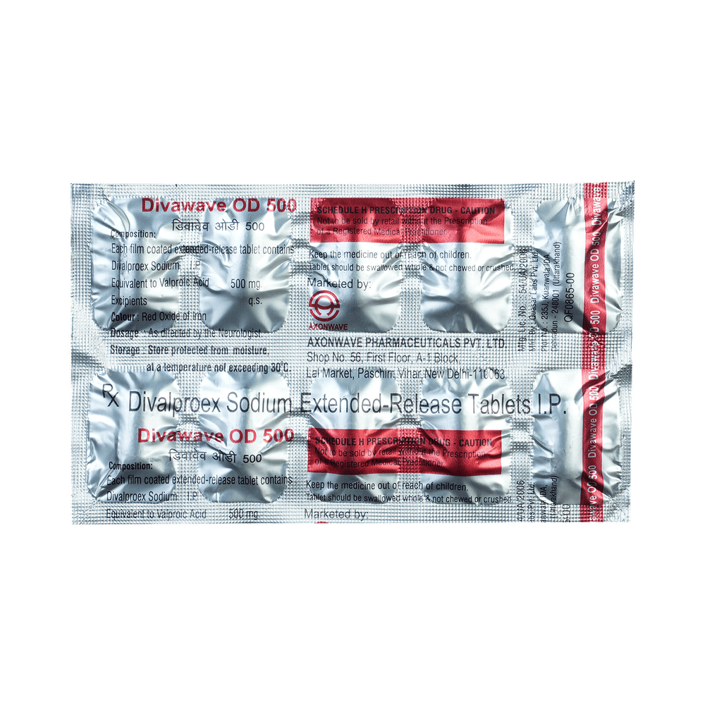 In Treatment of Bipolar disorderDivawave OD 500 Tablet ER works to restore the normal balance of nerve activity in your brain. It can help prevent extreme changes in mood and help you feel less agitated. You may experience fewer episodes of low mood. It can take several weeks for this medicine to work and you may still feel low during this time. It is likely that you will take this medicine for at least six months but possibly much longer. It needs to be taken regularly to work effectively. Do not stop taking it unless your doctor advises you to. You should continue to eat well and keep fit to reduce symptoms of bipolar disorder.In Treatment of Epilepsy/SeizuresDivawave OD 500 Tablet ER is an anticonvulsant (or anti-epileptic) medicine that works by decreasing the nerve impulses which cause the seizures. By controlling the frequency of seizures, it will help you go about your daily activities with more confidence. It helps reduce symptoms such as confusion, uncontrollable jerking movements, loss of awareness, and fear or anxiety.This medicine is not associated with any physical or psychological dependence (addiction) but it should not be stopped suddenly. It must be taken regularly as prescribed to be effective. Missing doses may trigger a seizure.show moreshow less