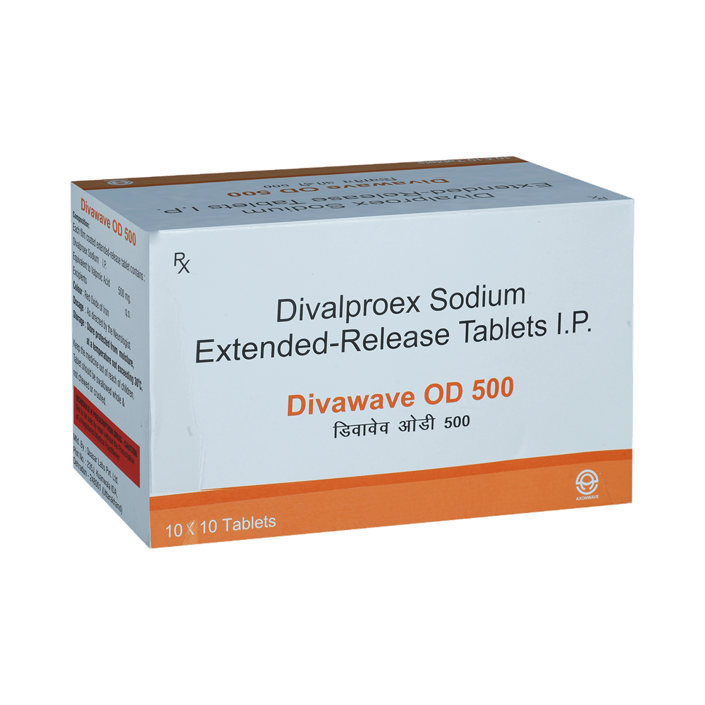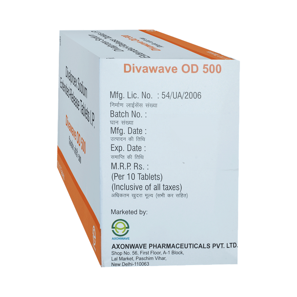 Divawave OD 500 Tablet ER is a medication used to treat epilepsy, seizures, bipolar disorder, mania, trigeminal neuralgia, and migraines. It works by stabilizing brain activity. Always use it under medical supervision for safe and effective treatment. Divawave OD 500 Tablet ER may be used alone or in combination with other medicines. Your doctor will determine the appropriate dose and frequency to effectively control your symptoms. You can take this medicine with or without food, but for the best results, take it at the same time each day. It usually takes a couple of weeks to work. It is important to take this medicine regularly and for as long as you are advised, even if you feel well. Missing doses may trigger seizures, and if you stop, your condition may get worse. It should never be stopped suddenly.The most common side effects of Divawave OD 500 Tablet ER include headache, constipation, nausea, vomiting, dizziness, weight gain, rash, back pain, and abdominal pain. Most of these are not serious. Continue taking the medicine, but consult your doctor if these side effects persist or become bothersome. However, if you notice a skin rash or redness, tell your doctor straight away. Long-term treatment with this medicine can cause osteoporosis (reduced bone mass) and increase your risk of breaking a bone. Also, Divawave OD 500 Tablet ER may rarely lead to suicidal thoughts and behaviors. If your mood becomes depressed, tell your doctor.Divawave OD 500 Tablet ER may not be suitable for everybody. Before using it, tell your doctor if you have ever had heart problems, kidney or liver disease, difficulty urinating, depression, or suicidal thoughts. Some medicines can interfere with it and should not be taken together, so tell your doctor about all the medicines you are taking to make sure it is safe for you. If you are pregnant, do not take this medicine without asking your doctor. Avoid drinking alcohol, as it may enhance certain side effects and increase the risk of seizures. You may need frequent blood tests to help your doctor make sure you are taking the right dose both before you start and while you are using it.