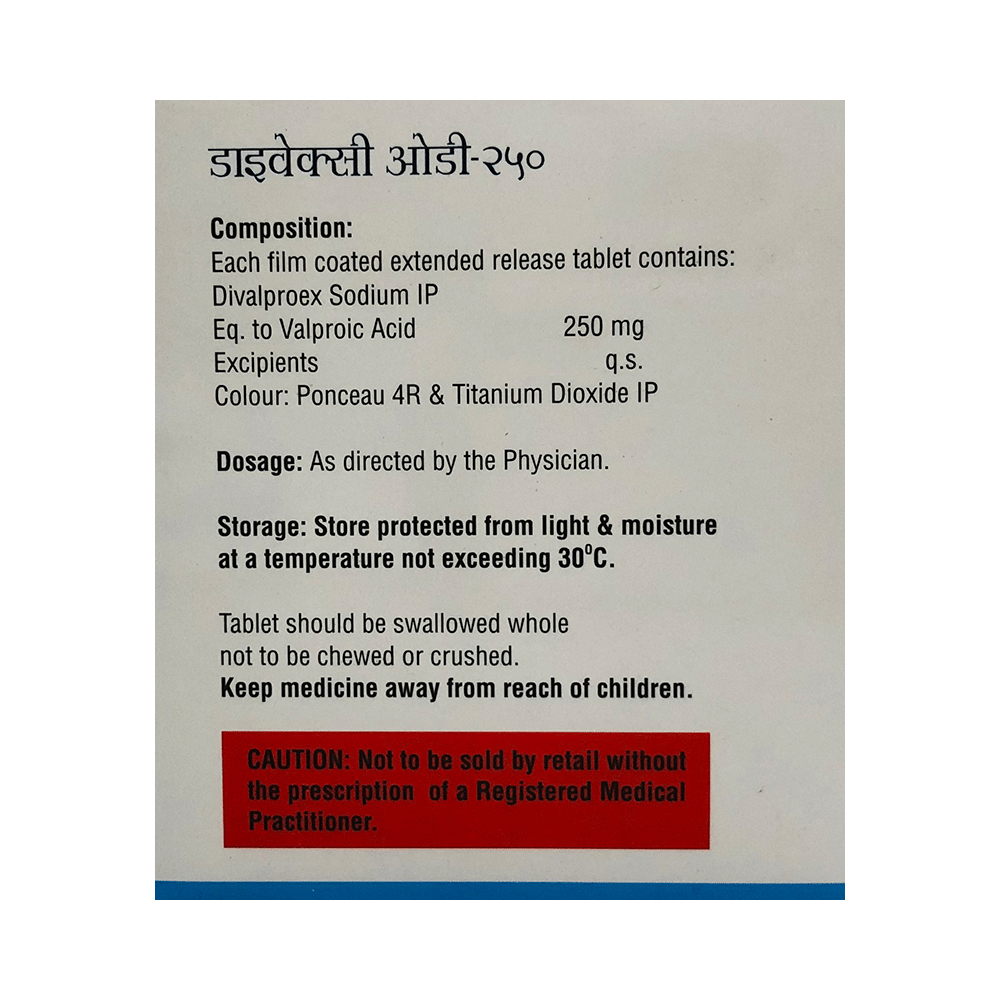 Divaxee OD 250 Tablet ER is a medication used to treat epilepsy, seizures, bipolar disorder, mania, trigeminal neuralgia, and migraines. It works by stabilizing brain activity. Always use it under medical supervision for safe and effective treatment. Divaxee OD 250 Tablet ER may be used alone or in combination with other medicines. Your doctor will determine the appropriate dose and frequency to effectively control your symptoms. You can take this medicine with or without food, but for the best results, take it at the same time each day. It usually takes a couple of weeks to work. It is important to take this medicine regularly and for as long as you are advised, even if you feel well. Missing doses may trigger seizures, and if you stop, your condition may get worse. It should never be stopped suddenly.The most common side effects of Divaxee OD 250 Tablet ER include headache, constipation, nausea, vomiting, dizziness, weight gain, rash, back pain, and abdominal pain. Most of these are not serious. Continue taking the medicine, but consult your doctor if these side effects persist or become bothersome. However, if you notice a skin rash or redness, tell your doctor straight away. Long-term treatment with this medicine can cause osteoporosis (reduced bone mass) and increase your risk of breaking a bone. Also, Divaxee OD 250 Tablet ER may rarely lead to suicidal thoughts and behaviors. If your mood becomes depressed, tell your doctor.Divaxee OD 250 Tablet ER may not be suitable for everybody. Before using it, tell your doctor if you have ever had heart problems, kidney or liver disease, difficulty urinating, depression, or suicidal thoughts. Some medicines can interfere with it and should not be taken together, so tell your doctor about all the medicines you are taking to make sure it is safe for you. If you are pregnant, do not take this medicine without asking your doctor. Avoid drinking alcohol, as it may enhance certain side effects and increase the risk of seizures. You may need frequent blood tests to help your doctor make sure you are taking the right dose both before you start and while you are using it.
