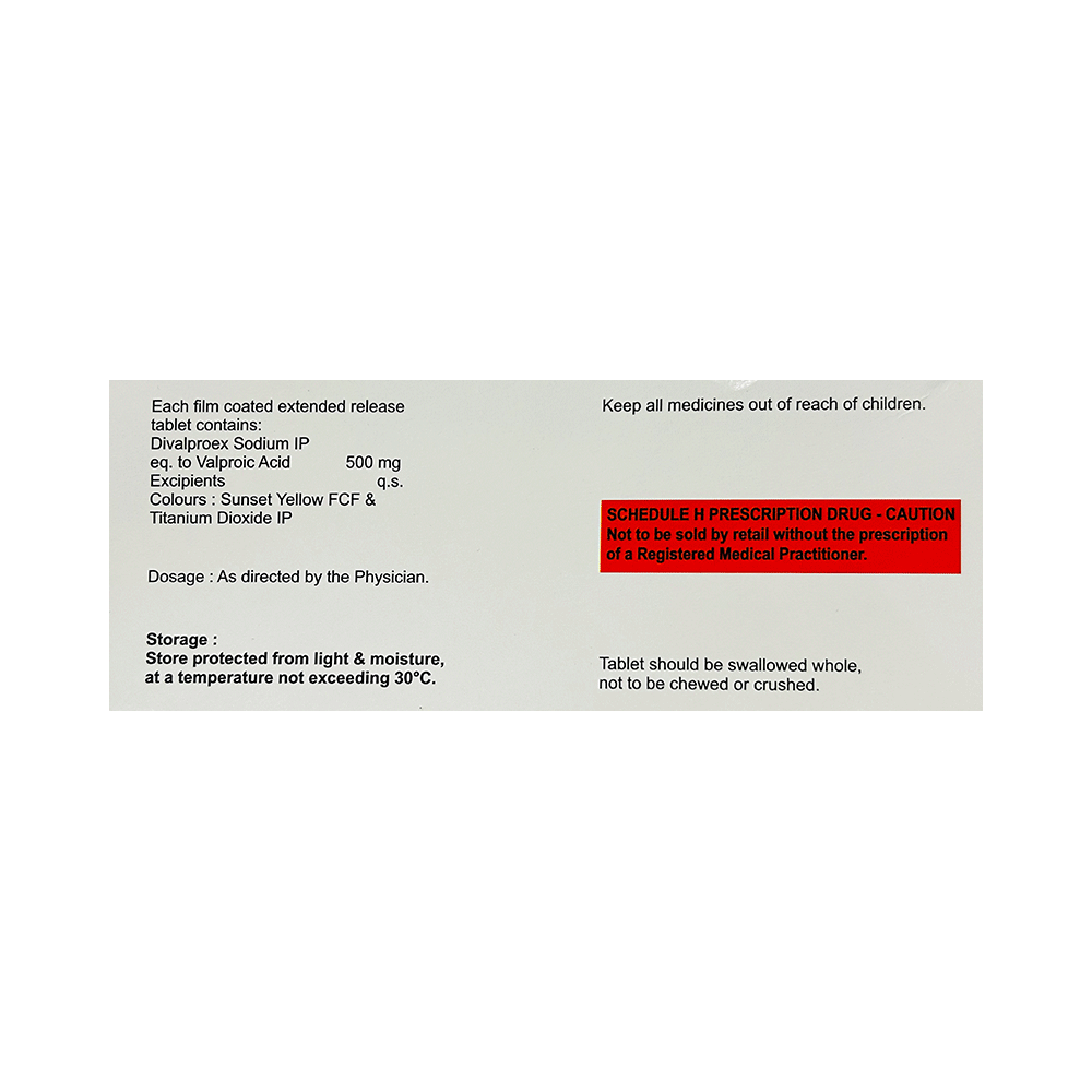 Divsys OD 500mg Tablet ER is a medication used to treat epilepsy, seizures, bipolar disorder, mania, trigeminal neuralgia, and migraines. It works by stabilizing brain activity. Always use it under medical supervision for safe and effective treatment. Divsys OD 500mg Tablet ER may be used alone or in combination with other medicines. Your doctor will determine the appropriate dose and frequency to effectively control your symptoms. You can take this medicine with or without food, but for the best results, take it at the same time each day. It usually takes a couple of weeks to work. It is important to take this medicine regularly and for as long as you are advised, even if you feel well. Missing doses may trigger seizures, and if you stop, your condition may get worse. It should never be stopped suddenly.The most common side effects of Divsys OD 500mg Tablet ER include headache, constipation, nausea, vomiting, dizziness, weight gain, rash, back pain, and abdominal pain. Most of these are not serious. Continue taking the medicine, but consult your doctor if these side effects persist or become bothersome. However, if you notice a skin rash or redness, tell your doctor straight away. Long-term treatment with this medicine can cause osteoporosis (reduced bone mass) and increase your risk of breaking a bone. Also, Divsys OD 500mg Tablet ER may rarely lead to suicidal thoughts and behaviors. If your mood becomes depressed, tell your doctor.Divsys OD 500mg Tablet ER may not be suitable for everybody. Before using it, tell your doctor if you have ever had heart problems, kidney or liver disease, difficulty urinating, depression, or suicidal thoughts. Some medicines can interfere with it and should not be taken together, so tell your doctor about all the medicines you are taking to make sure it is safe for you. If you are pregnant, do not take this medicine without asking your doctor. Avoid drinking alcohol, as it may enhance certain side effects and increase the risk of seizures. You may need frequent blood tests to help your doctor make sure you are taking the right dose both before you start and while you are using it.