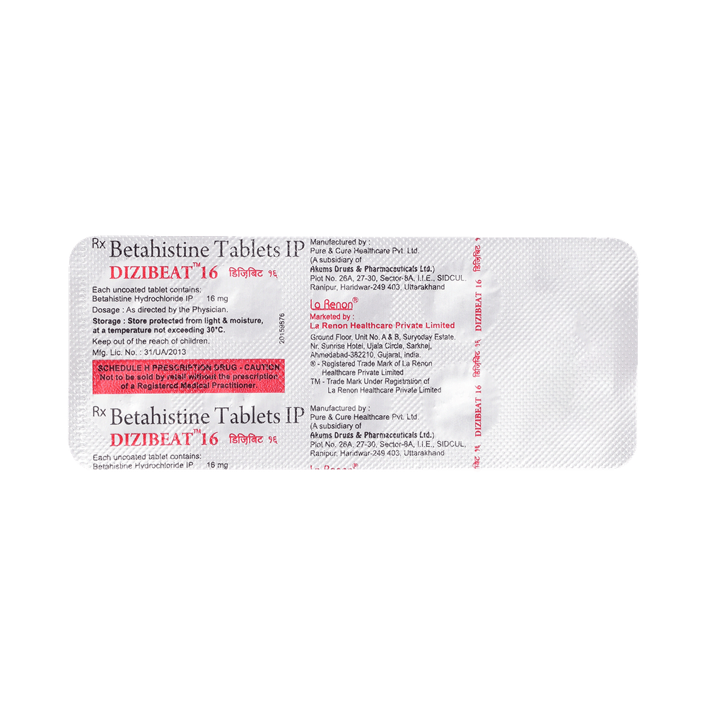 In Treatment of Meniere's diseaseDizibeat 16mg Tablet improves blood flow to the inner ear which reduces the pressure of excess fluid there. It is this pressure that is thought to cause the symptoms of nausea, vertigo (dizziness), tinnitus (ringing in your ears), and hearing loss in people who have Ménière’s disease. This medicine makes the symptoms milder and reduces the number of times you get the symptoms. It will be more effective if you take this medicine regularly as prescribed so try not to miss doses. It may take a couple of weeks before you notice any improvements but keep taking it, even if you do feel better until your doctor advises it is safe to stop.